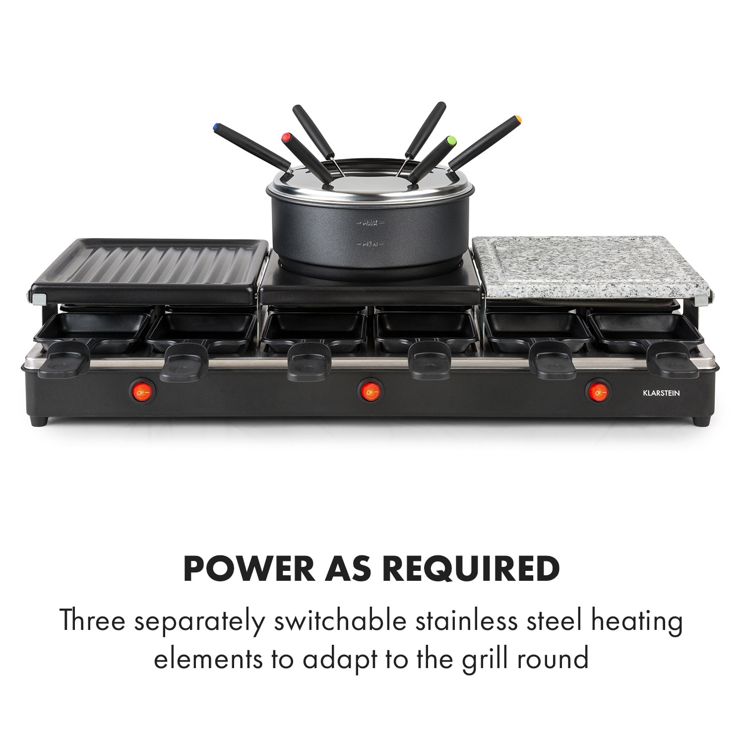 Všestranná kombinácia pochúťok: raclette elektrický gril Klarstein Fonduelette XL kombinuje tri vrcholy spoločného stolovania v jednom zariadení a zaisťuje tak príjemné párty jedlo od prvej do poslednej minúty. Zatiaľ čo na vrchnej časti s prírodným kameňom, grilovacou platňou a platňou na palacinky sa pečie a pripravujú sa chutné fondue výtvory, v spodnej časti sa na raclette raclette panvičkách zapeká a gratinuje, až kým sa syr úplne neminie. A pretože vo veľkej skupine oveľa príjemnejšie jedlo chutí, môže si tu jedlo prichystať až 12 ľudí.Pri grile Klarstein Fonduelette XL sa kreativite medze nekladú. Dvanásť raclette panvičiek sa dá naplniť vlastnými výtvormi a následne ich možno pripraviť v raclette grile pod tromi výhrevnými telesami z ušľachtilej ocele. Medzitým na troch grilovacích platniach príjemne prská syr, zelenina, mäso a ryby. Na pevnej kamennej grilovacej doske možno pripraviť zeleninu mimoriadne šetrne a s nízkym obsahom tuku. A o dezert alebo raňajky bude postarané, keď sa na jednej zo štyroch foriem platne na palacinky pripravia palacinky či omeleta. Vďaka nepriľnavému povrchu možno delikatesy bez problémov odobrať z panvičiek a grilovacej platne.Hrniec na fondue umožňuje pripraviť ešte viac pochúťok. Lahodné syrové dipy s chlebom, chutné mäsové fondue s vínom, olejom či vývarom alebo sladké čokoládové fondue s ovocím rozšíria kulinárske pochúťky, ktoré pripravuje stolný gril Klarstein Fonduelette XL. Praktický kryt drží prázdne fondue vidličky v ich polohe a zabraňuje zašpineniu. Špízy sú farebne odlíšené pre rozpoznanie.Vykurovací výkon 1650 W sa postará o rýchle zahriatie raclette grilu. Mimoriadne praktické je trojdielne rozdelenie vykurovacích telies, ktoré je možné zapínať každé zvlášť. To znamená, že v prevádzke je iba tá časť grilu, ktorá je potrebná. Aby si nikto na horúcom zariadení Fonduelette XL od spoločnosti Klarstein nepopálil prsty, všetky panvičky a fondue vidličky sú vybavené tepelne izolovanými rukoväťami. Po jedle uľahčia čistenie zariadenia odnímateľné grilovacie platne a fondue súčasti. Takže ďalšiemu spoločnému a nekomplikovanému stolovaniu s priateľmi a rodinou nestojí nič v ceste.