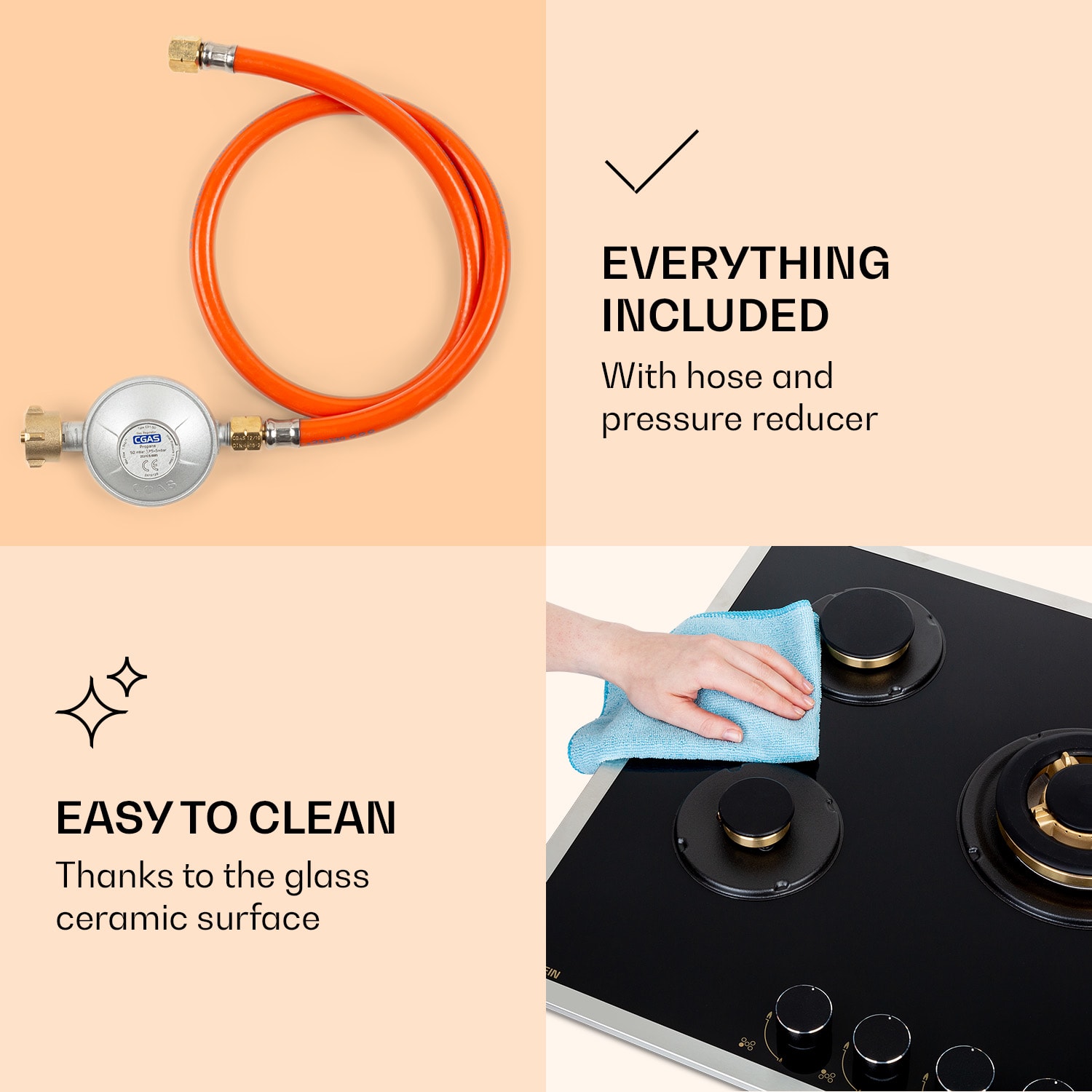 Plynová varná doska Klarstein Goldflame 5 Prime pozostáva z piatich vysoko kvalitných horákov Messing, ktoré sú umiestnené na 8 mm hrubej sklokeramickej doske. S celkovým výkonom 10,4 kW poriadne podkúria tvojim hrncom na mriežkach z liatiny. Aby ste Goldflame Domino Prime zapálili, nepotrebujete žiadny dodatočný plameň, pretože plynový sporák je vybavený so zapaľovaním SnapJetIgnition. Prívod tepla regulujete pomocou otočných ovládačov. O luxusný vrchol vzhľadu sa postará rám z nerezovej ocele.Efektívny, rýchly a šetriaci energiu: plynový varná doska Klarstein Goldflame 5 Prime.