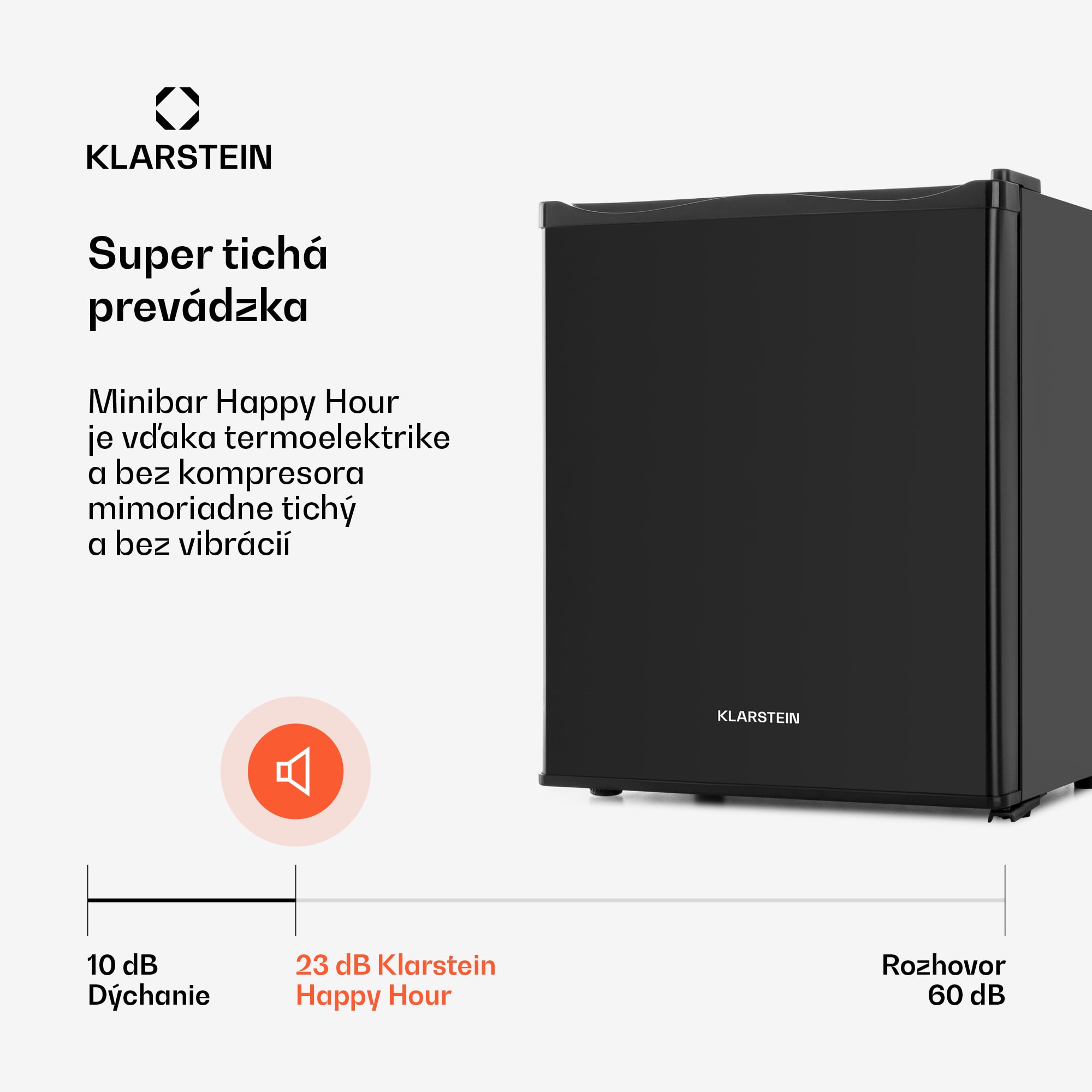 Klarstein Happy Hour, minibar, 5-15°C, energet. trieda G, tichý, 23dB, LED svetlo