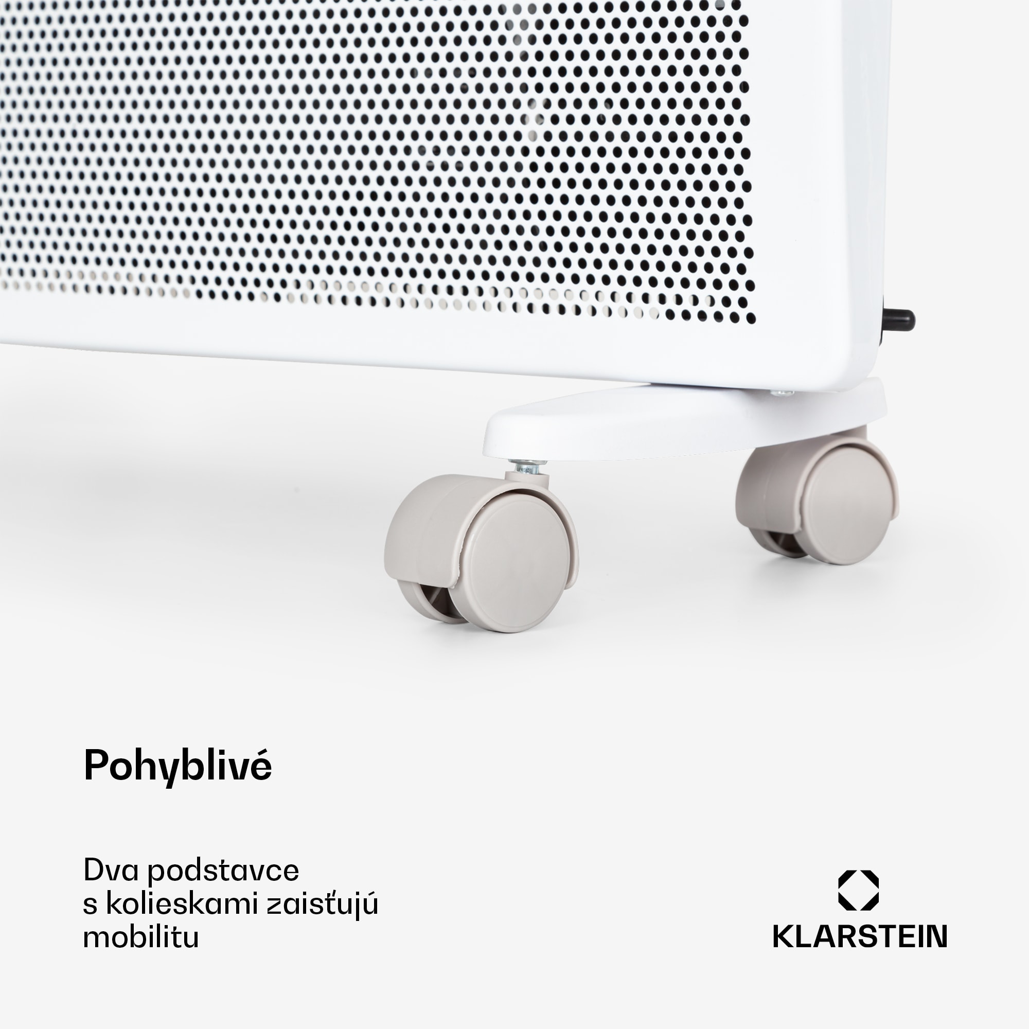 Príjemné teplo: ohrievač Klarstein Hot Spot Slimcurve Double Wave pracuje pomocou kombinácie konvekčnej a infračervenej technológie. Kým ohrievač ohrieva vzduch v miestnosti spoľahlivým výkonom 2000 W, infračervené vykurovacie teleso sa postará o príjemne teplý pocit na pokožke.Vykurovacie teleso s výkonom 2000 W sa dá plynulo nastavovať medzi 5 a 45 °C, a preto sa dokáže ideálne prispôsobiť individuálnym požiadavkám vykurovania. Vykurovací panel s rozmerom 83 x 40 cm je možné pripevniť priamo na stenu alebo sa dá použiť ako mobilné stojace zariadenie. Potrebnú mobilitu zabezpečujú dve pevné nožičky, každá s dvomi kolieskami, a 150 cm dlhý kábel. S výkonom 2000 W vyhrieva zariadenie bez problémov miestnosti do veľkosti 40 m². Týždenný časovač, ktorý je tiež k dispozícii, umožňuje naprogramovať podľa potreby časy vykurovania na každý deň v týždni – tým sa zaručí vždy príjemne teplá miestnosť. Funkcia detekcie otvorených okien OpenWindow sa navyše postará o automatické vypnutie zariadenia pri otvorení okna. Všetky nastavenia je možné vykonať priamo na ovládacom paneli ohrievača. Vďaka prehľadnému LED displeju budeš mať vždy prehľad. Dodatočnú bezpečnosť poskytuje nastaviteľná detská bezpečnostná poistka, ktorá zabraňuje náhodnému zapnutiu alebo vypnutiu, a tiež integrovaná ochrana voči prehriatiu. Ohrievač Klarstein Hot Spot Slimcurve Double Wave nie je výnimočný len z hľadiska technológie. Presvedčí aj svojím štýlovým dizajnom. Zaoblené hrany a lesklý povrch vyžarujú príjemné teplo a popri tom aj nádych luxusu. Tento konvektor je ideálny pre moderné domácnosti.Ohrievač Klarstein Hot Spot Slimcurve Double Wave šíri príjemné teplo v chladných dňoch.Upozornenie: Tento produkt je určený len na použite v dobre izolovaných miestnostiach alebo na príležitostné použitie.