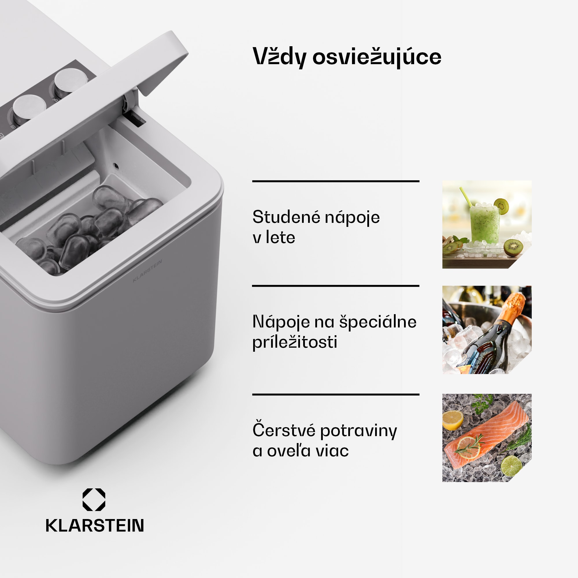 Na chladenie nápojov počas horúcich dní: zariadenie na výrobu ľadu Klarstein IceCraft je absolútnou nevyhnutnosťou na leto a vyčaruje dokonalé kocky ľadu len za šesť minút. Nič teda nestojí v ceste tomu, aby ste si mohli vychutnať osviežujúce limonády, koktaily alebo smoothies.Stroj na výrobu ľadu IceCraft od spoločnosti Klarstein posúva letné potešenie na úplne novú úroveň. Prístroj vyformuje okrúhle kocky ľadu za krátky čas a vždy sa postará o krištáľovo čistú dokonalosť. Zakalené kocky ľadu a nevzhľadné tvary sú konečne minulosťou. Výrobník ľadu produkuje dve rôzne veľkosti kociek ľadu – malé kocky ľadu môžu okrem iného udržať čerstvé a chladné morské plody a pivo na najbližšej grilovačke. Veľké kocky ľadu sú zasa ideálne pre všetky nápoje, aby ich rýchlo schladili.Výkonný výrobník ľadu IceCraft od spoločnosti Klarstein zmrazí vodu na ľad len za šesť minút, a preto je pripravený aj na spontánne použitie, aby poskytol osviežujúcu pochúťku počas teplých dní. Stroj na výrobu ľadu je tiež nevyhnutnou výbavou pri príprave ďalšej záhradnej párty. Za 24 hodín možno vyrobiť až 12 kg ľadu. Dostatok chladených nápojov pre všetkých hostí.Stroj na výrobu ľadu IceCraft od spoločnosti Klarstein sa ľahko obsluhuje pomocou dotykového panela. Vďaka svojmu modernému vzhľadu a priehľadnému panelu vyzerá skvele v každej kuchyni a na každom barovom pulte. Čistenie stroja na výrobu ľadu je obzvlášť praktické. V automatickom režime čistenia vykonáva spotrebič tento úkon sám. Tak sa pohodlne usaďte a vychutnajte si chladný nápoj.