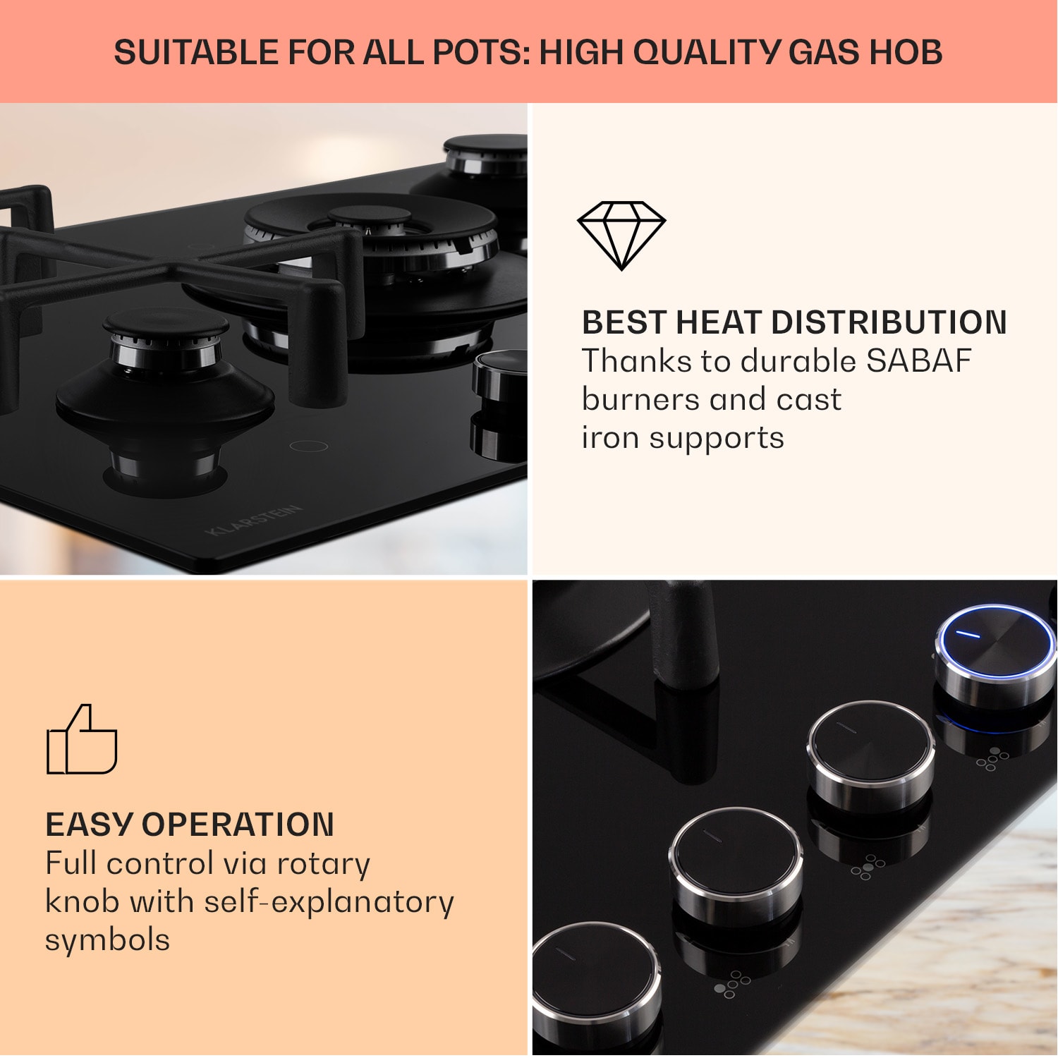 Klarstein Illuminosa 5, plynová varná doska, 5 Sabaf horákov, sklokeramika, čierna