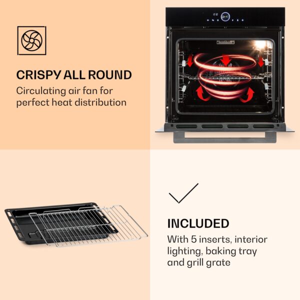 Vstavaná rúra Illuminosa Smart od Klarstein zaujme silnými hodnotami výkonu, až 11 funkciami a štýlovo jednoduchým vstavaným dizajnom. A vďaka integrácii IOT ho možno kompletne ovládať a monitorovať prostredníctvom aplikácie – odkiaľkoľvek. V 73-litrovom interiéri vstavanej rúry Klarstein Illuminosa Smart môžete pripravovať nielen koláče, zapekané jedlá alebo pizzu: So svojimi 11 funkciami: rozmrazovanie, eco, funkcia pizza, spodný ohrev, horný a spodný ohrev, konvekcia, gril a pologril, konvekčný gril a kruhové výhrevné teleso s konvekciou spĺňa všetky požiadavky na nekomplikovanú a efektívnu kuchynskú rúru. Okrem toho má vstavaná rúra Illuminosa Smart manuálny režim s ľahko použiteľným časovačom a rýchlym predhrievaním pri voliteľných teplotách od 30 do 250 °C. A vďaka aplikácii Klarstein môžete všetky funkcie ovládať nielen na rúre, ale aj kompletne cez smartfón.Elektrická rúra Klarstein Illuminosa Smart aj skvele vyzerá: jej elegantný dizajn s trojitým presklením dvierok vytvára štýlové akcenty a ideálne zapadá do každej kuchyne.