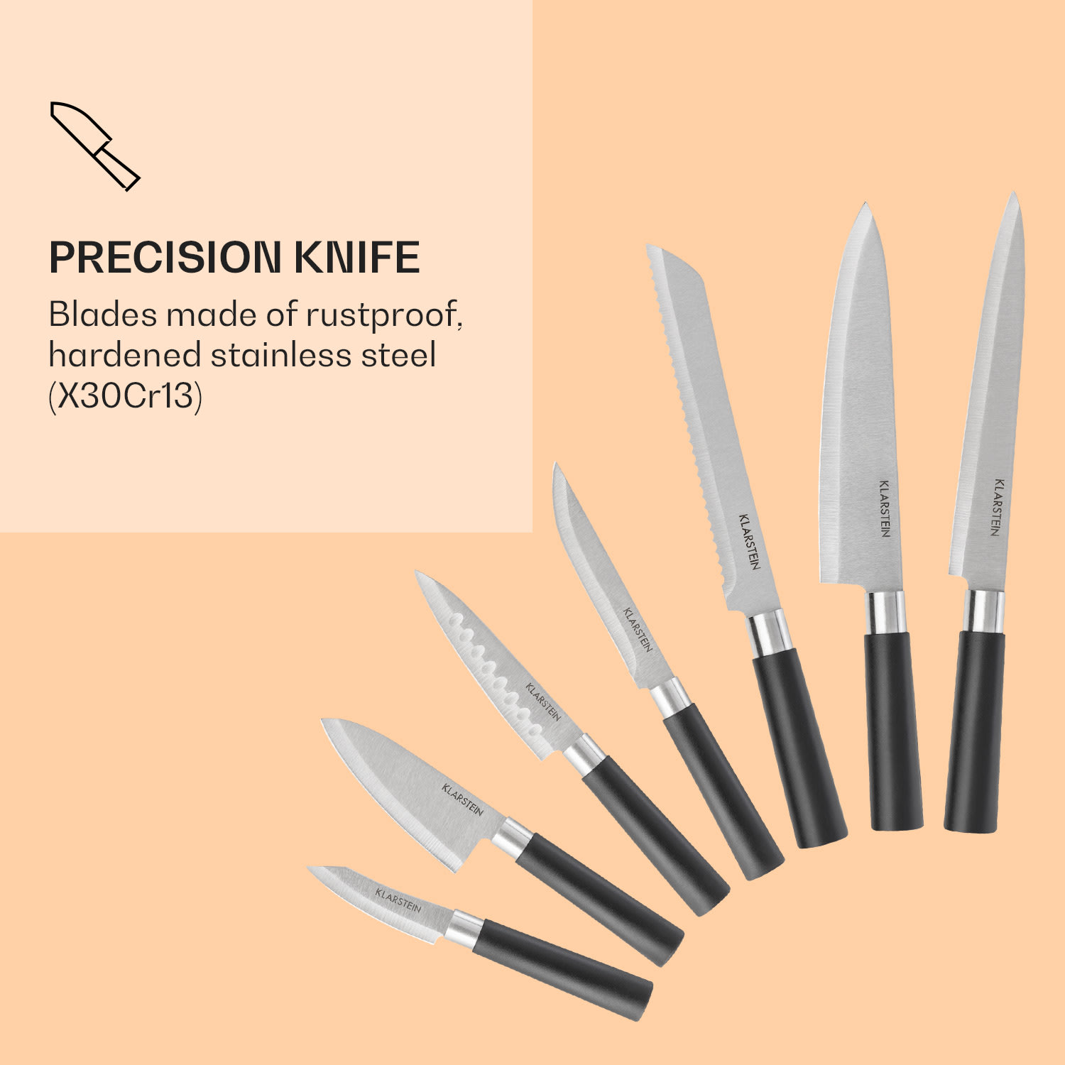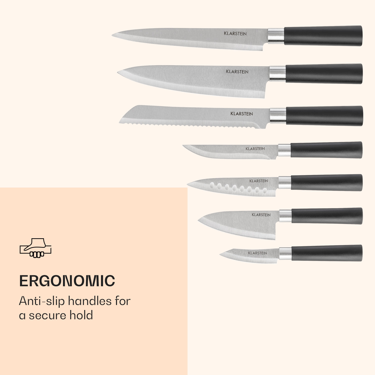 Ostré nože sú v kuchyni absolútnou nevyhnutnosťou: Klarstein Kitano Plus sada nožov, 7 rôznych precíznych čepelí z nehrdzavejúcej kalenej ocele. Samozrejme, tieto ostré kúsky nie sú bez ochrany: Nádherne tvarovaný blok na nože z kvalitného dreva udržuje všetko v poriadku. Po boku noža a bloku je praktická doska na krájanie z kvalitného bambusu. Keď sa nepoužíva, tvrdá doska vďaka praktickému držiaku tesne prilieha k bloku nožov, a preto je vždy pripravená na použitie. Tím snov vo vašej kuchyni: Klarstein Kitano Plus Sada nožov a vy!