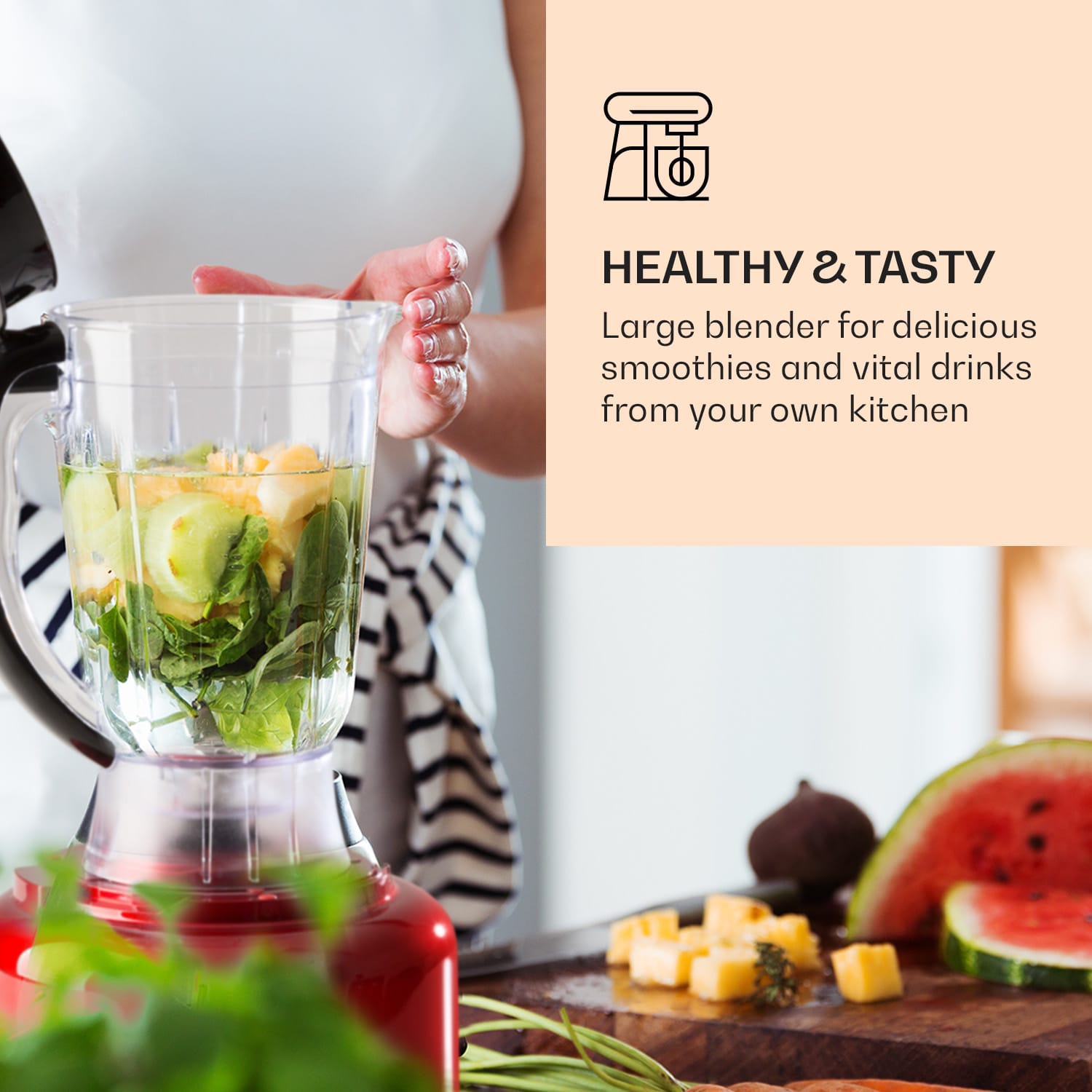 Jeden na všetko: multifunkčný mixér Klarstein Luca ihneď prevezme skoro všetky úlohy v kuchyni – len variť musíš stále sám. Jedno či rozsekať, strúhať, mixovať, miešať, sekať, odšťavovať, nakrájať hranolky, emulgovať, pomlieť kávu alebo drviť ľad, multifunkčný mixér Klarstein Luca má určite k dispozícii správnu funkciu vo svojom 20-dielnom príslušenstve. Silný kuchynský pomocník je so svojim výkonom 1000 wattov pripravený na všetky požiadavky a pomáhať ti urobiť skoro všetky práce v kuchyni. S objemom 3 litre má stojanový mixér dostatok miesta na cesto, smoothies a omáčky a dokáže aj premeniť rodinnú porciu zemiakov na čisto nakrájané hranolky. Tu máš všetko pod kontrolou, nie len pomocou 6 prevádzkových režimov a bezstupňovo nastaviteľnou rýchlosťou sekáča Luca, ale aj to, že sa do šalátovej misy, panvice a hrnca dostanú len tie najlepšie prísady. Preto sú všetky plastové časti vyrobené bez BPA.Aby aj upratovanie išlo úplne jednoducho od ruky, podporuje Ťa kuchynský mixér Klarstein Luca svojou samo čistiacou funkciou a jeho súčasti môžu byť úplne jednoducho umývané v umývačke riadu. Urob si život ľahší: s multifunkčným kuchynským prístrojom Klarstein Luca máš jeden na všetko.