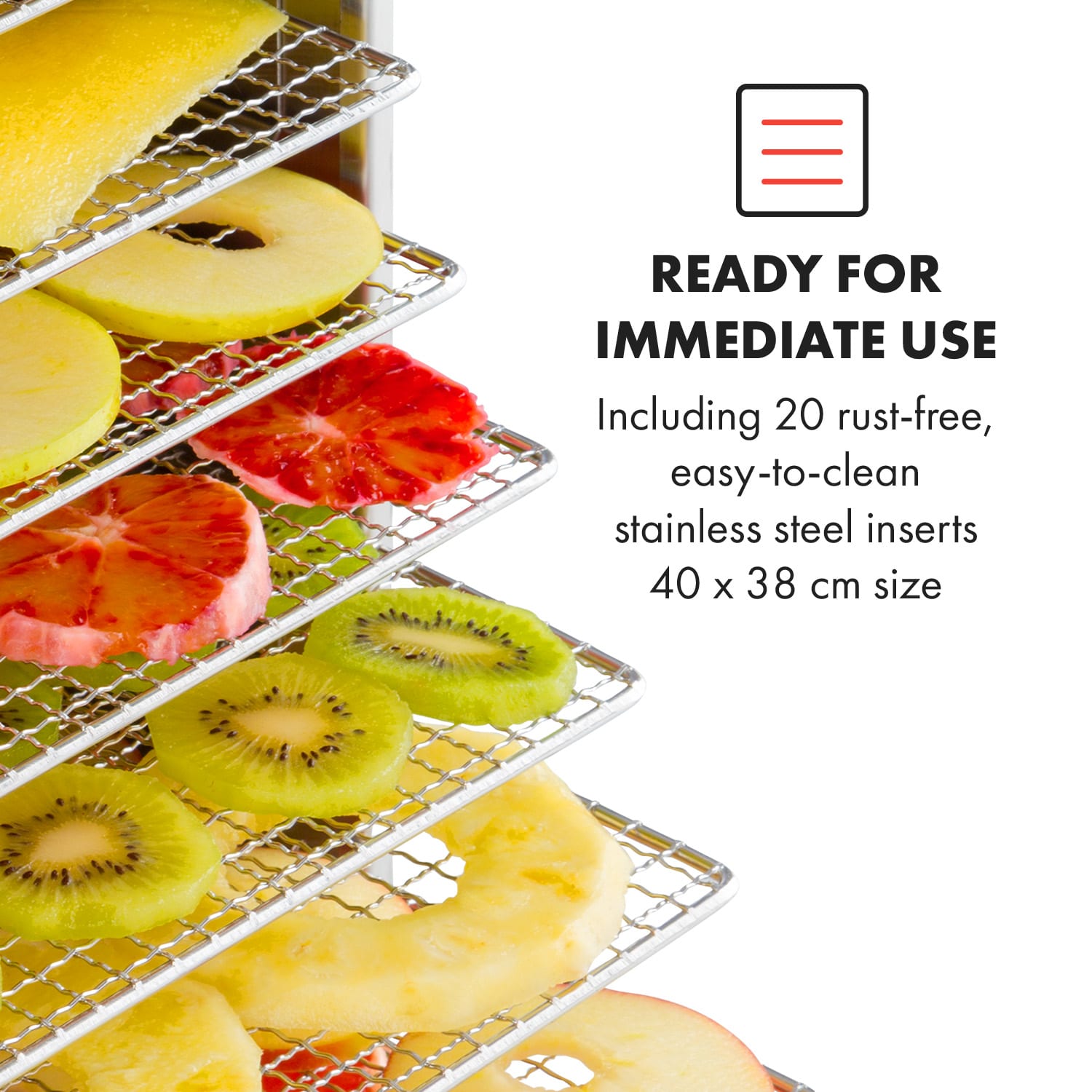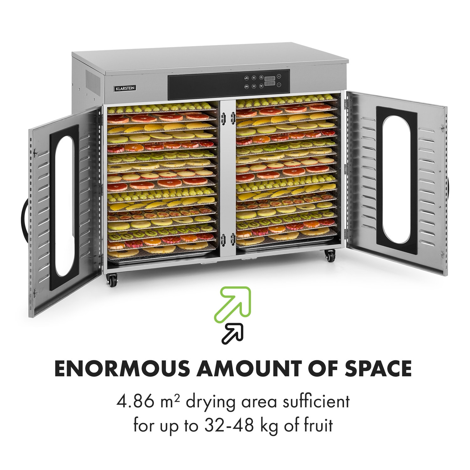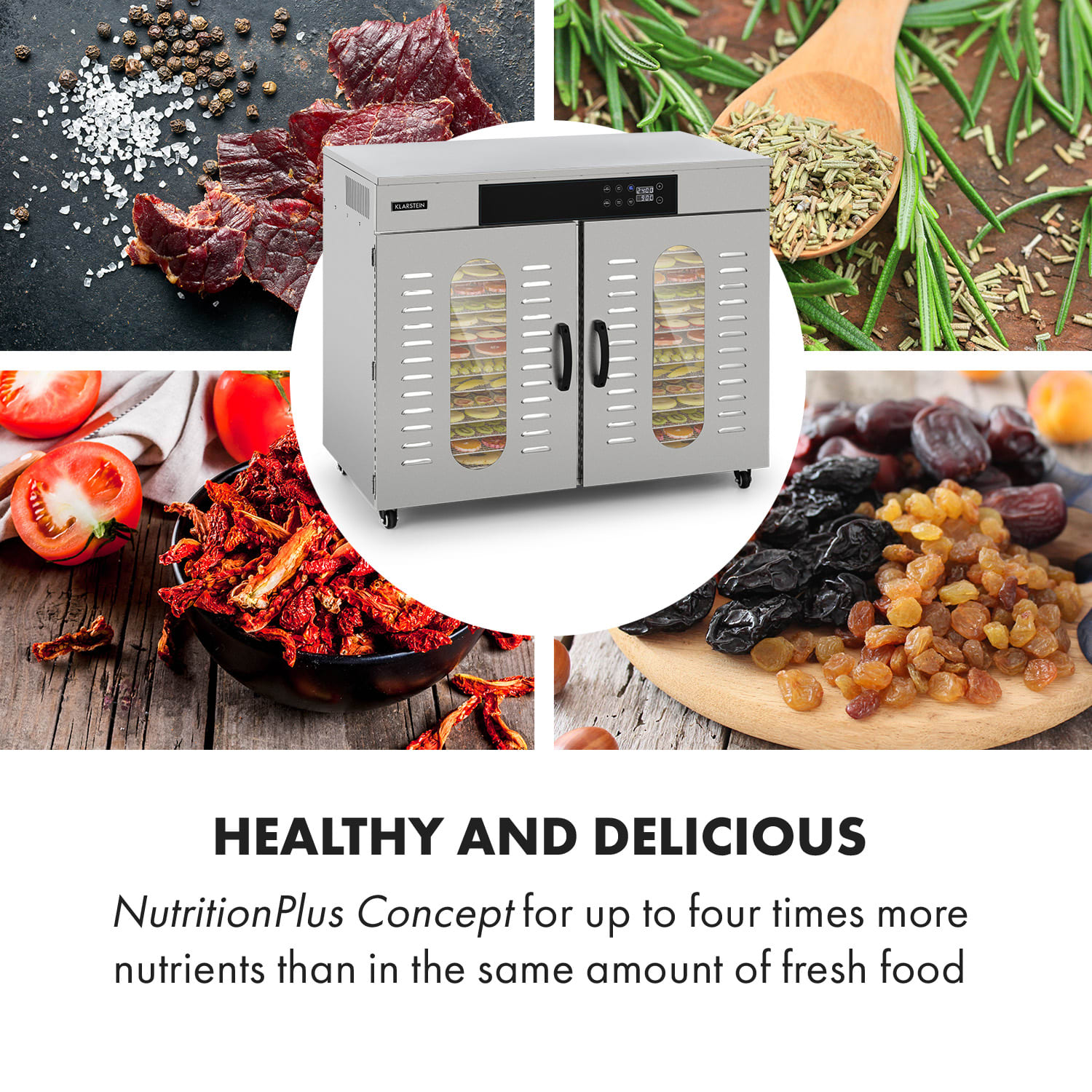 Výkonná sušička potravín Klarstein Master Jerky 500 suší ovocie, zeleninu, mäso a iné potraviny v rekordnom tempe a vyrába tak lahodné, trvanlivé pochúťky a suroviny. Či už sušené ovocie bohaté na vitamíny, ako napríklad jablkové a banánové lupienky, alebo zdravá zelenina ako sušené paradajky – Master Jerky 500 sa postará o každú pochúťku.S enormným vykurovacím výkonom 3000 W a rovnomerným rozložením tepla sa sušička potravín Master Jerky 500 postará o to, že v potravinách neostane žiadna voda a že čas sušenia bude krátky. 32 odnímateľných úrovní na sušenie z ušľachtilej ocele poskytuje priestor po 40 x 38 cm pre celkovú sušiacu plochu 4,86 m² – ideálne podmienky na profesionálne sušenie, napríklad v špecializovaných obchodoch na sušené hovädzie mäso, čaje alebo sušené ovocie. Pre flexibilnú prípravu rôznych potravín je možné nastaviť teplotu na dotykovom ovládacom paneli od 40 do 90 °C. Časovač až do 24 hodín navyše zaručuje optimálne prispôsobenie sušeným potravinám. Vďaka plne automatickému procesu sušenia s exaktným dodržaním teploty sa podarí všetko perfektne. Dôležité minerály a vitamíny pritom ostanú zachované, chuť sa zintenzívni. Sušené potraviny tak obsahujú až 4-krát viac živín ako rovnaké množstvo čerstvých potravín. Zariadenie Master Jerky 500 je vhodné aj na výrobu sušených kvetov na aranžovanie alebo na šetrnú prípravu sušených byliniek a čajov.Čistenie sušičky potravín po ukončení procesu sušenia je úplne jednoduché: police z ušľachtilej ocele je možné bezproblémovo umyť alebo vyčistiť v umývačke riadu. Konštrukcia z ušľachtilej ocele sa jednoducho utrie a dá sa presunúť vďaka kolieskam.