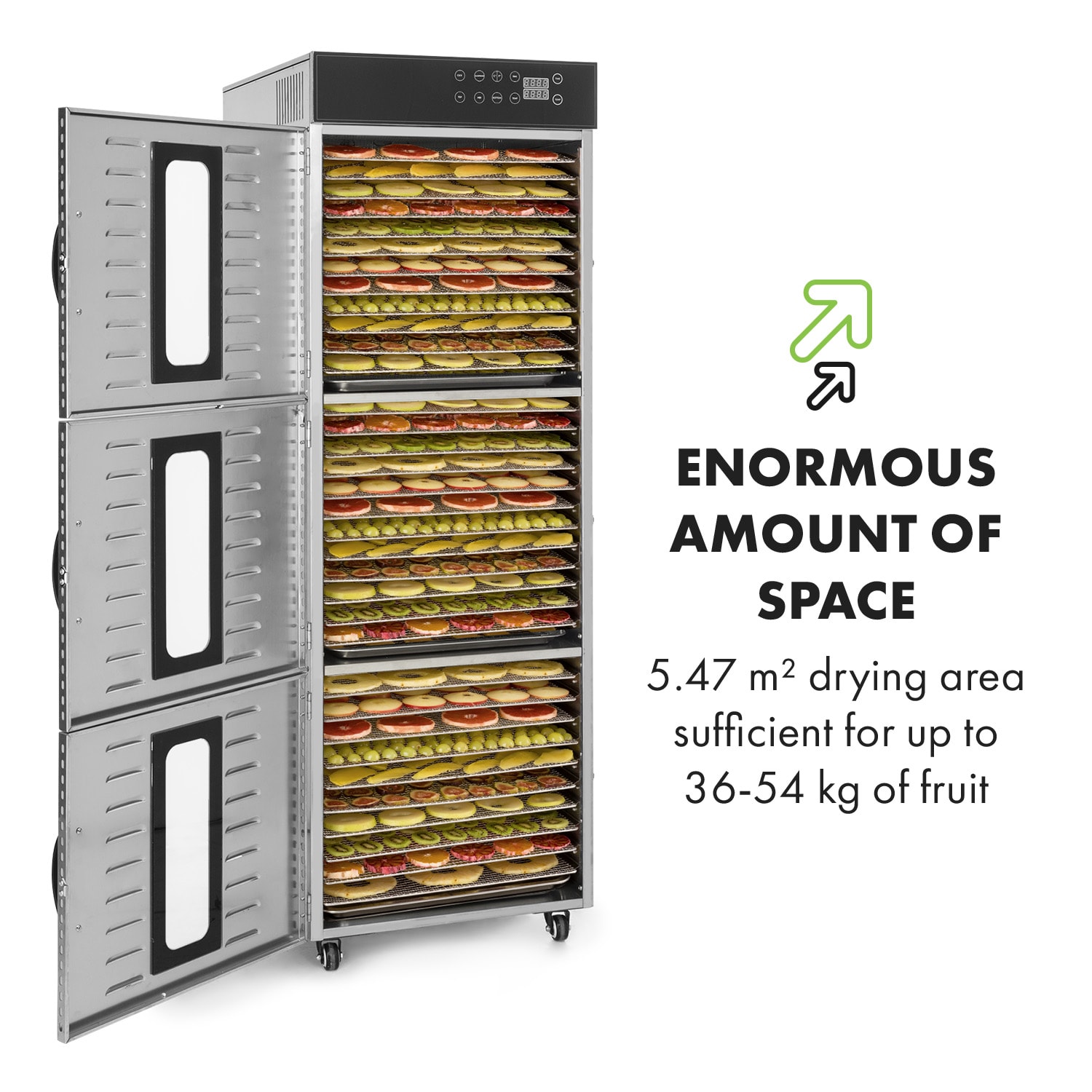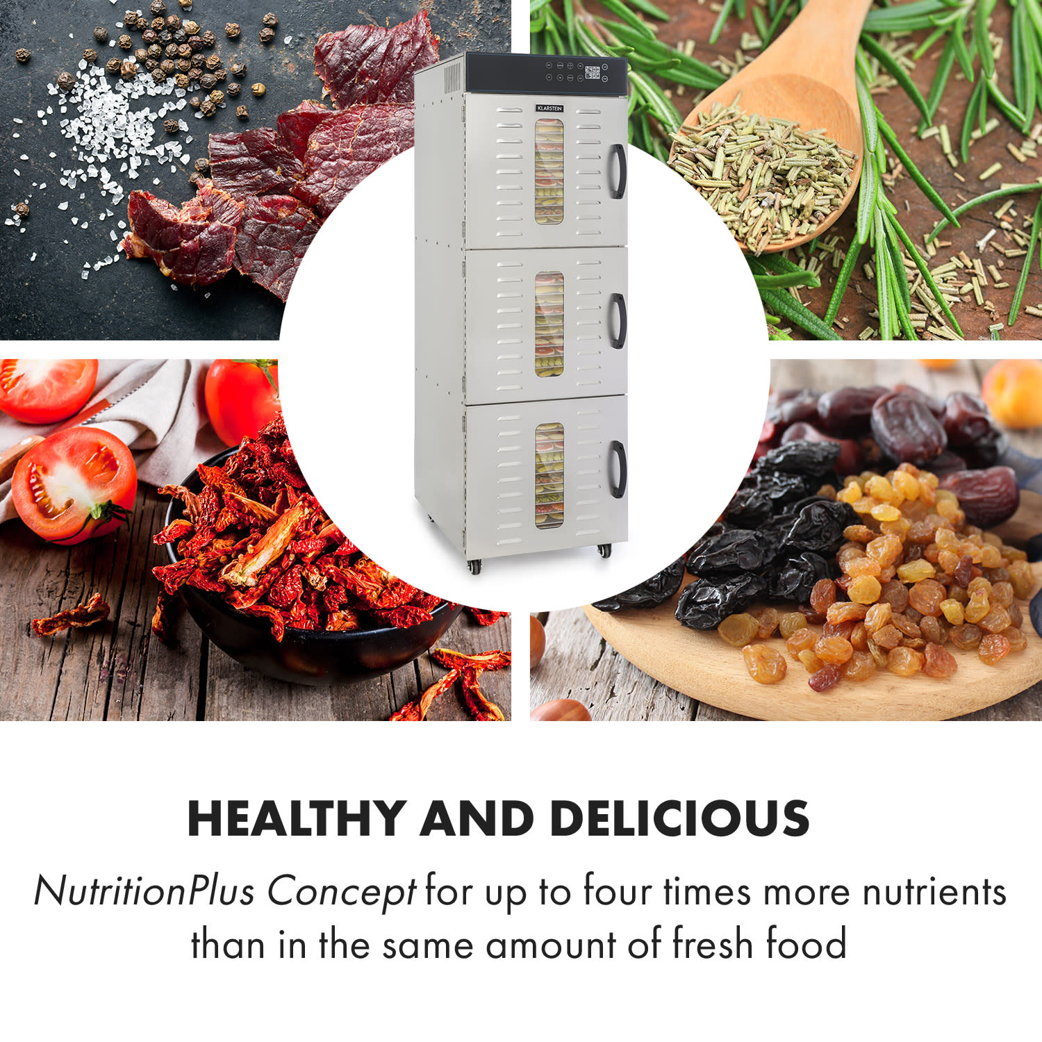Výkonná sušička potravín Klarstein Master Jerky 550 suší ovocie, zeleninu, mäso a iné potraviny v rekordnom tempe a vyrába tak lahodné, trvanlivé pochúťky a suroviny. Či už sušené ovocie bohaté na vitamíny, ako napríklad jablkové a banánové lupienky, alebo zdravá zelenina ako sušené paradajky – Master Jerky 550 sa postará o každú pochúťku.S enormným vykurovacím výkonom 2400 W a rovnomerným rozložením tepla sa sušička potravín Master Jerky 550 postará o to, že v potravinách neostane žiadna voda a že čas sušenia bude krátky. 36 odnímateľných úrovní na sušenie z ušľachtilej ocele poskytuje priestor po 40 x 38 cm pre celkovú sušiacu plochu 5,47 m² – ideálne podmienky na profesionálne sušenie, napríklad v špecializovaných obchodoch na sušené hovädzie mäso, čaje alebo sušené ovocie. Pre flexibilnú prípravu rôznych potravín je možné nastaviť teplotu na dotykovom ovládacom paneli od 40 do 90 °C. Časovač až do 24 hodín navyše zaručuje optimálne prispôsobenie sušeným potravinám. Vďaka plne automatickému procesu sušenia s exaktným dodržaním teploty sa podarí všetko perfektne. Dôležité minerály a vitamíny pritom ostanú zachované, chuť sa zintenzívni. Sušené potraviny tak obsahujú až 4-krát viac živín ako rovnaké množstvo čerstvých potravín. Zariadenie Master Jerky 550 je vhodné aj na výrobu sušených kvetov na aranžovanie alebo na šetrnú prípravu sušených byliniek a čajov.Čistenie sušičky potravín po ukončení procesu sušenia je úplne jednoduché: police z ušľachtilej ocele je možné bezproblémovo umyť alebo vyčistiť v umývačke riadu. Konštrukcia z ušľachtilej ocele sa jednoducho utrie a dá sa presunúť vďaka kolieskam. Sušička potravín je tak ideálnym pomocníkom v každej kuchyni.