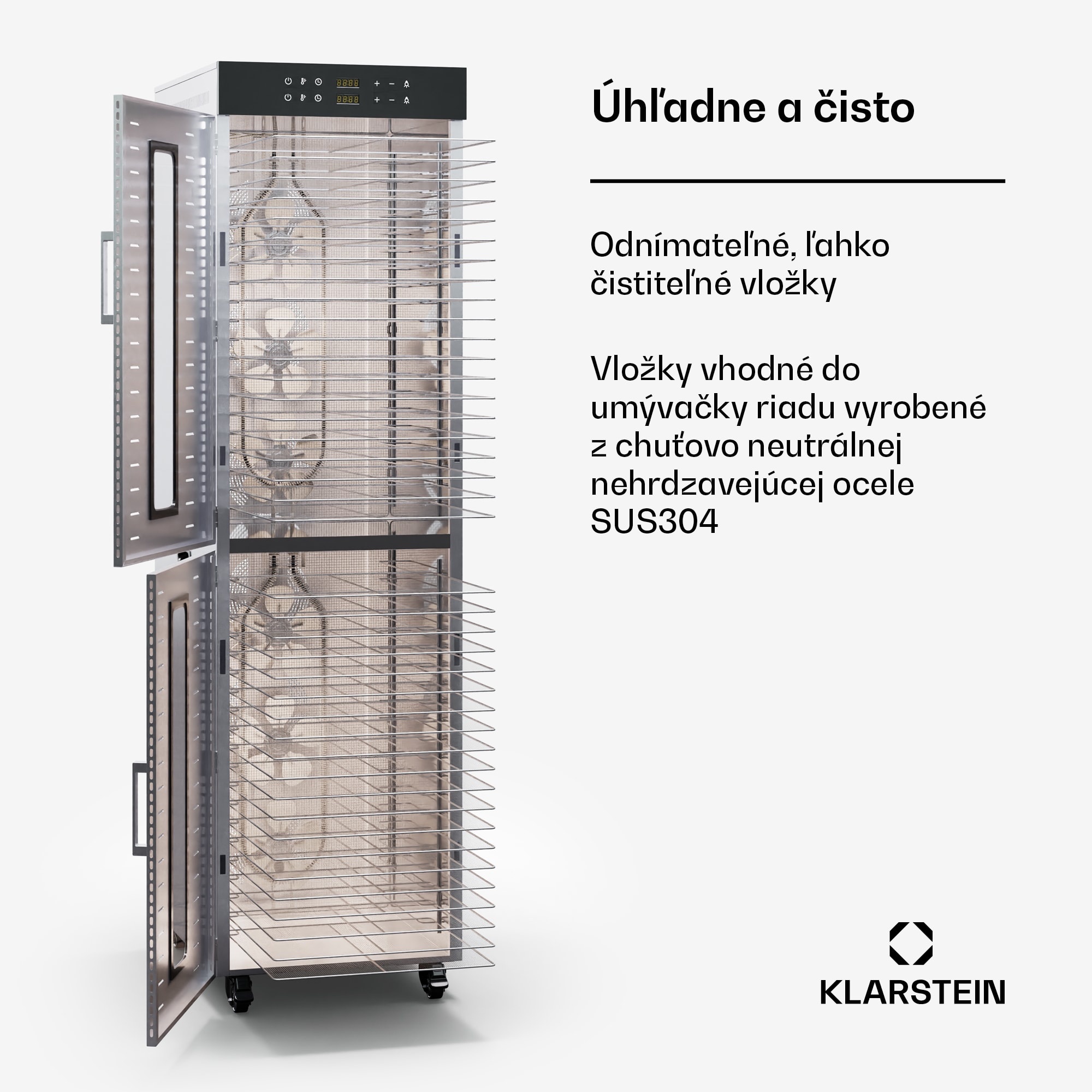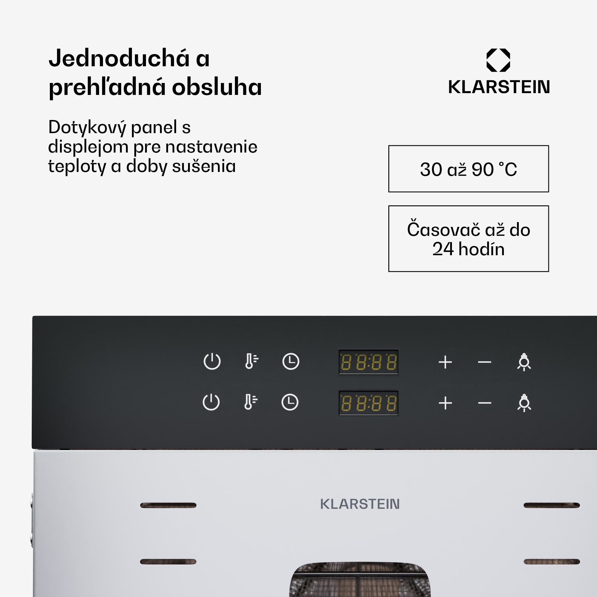 Výkonná sušička potravín Klarstein MasterJerky 600 suší ovocie, zeleninu, mäso a ďalšie potraviny rekordnou rýchlosťou. To znamená, že si môžete sami pripraviť chutné občerstvenie a prísady s dlhou životnosťou za krátky čas. Či už sušené ovocie bohaté na vitamíny, ako sú jablkové a banánové lupienky, alebo zdravá zelenina, ako sú sušené paradajky. Master Jerky 600 má pre každú potravinu tú správnu teplotu sušenia.Sušička Klarstein Master Jerky 600 so svojím enormným tepelným výkonom 4 000 W a rovnomernou distribúciou tepla vďaka 6 ventilátorom (tri v každej komore) zaisťuje optimálne sušenie potravín a krátku dobu sušenia. Každá zo 40 vyberateľných políc z nehrdzavejúcej ocele ponúka 40 x 38 cm priestoru pre celkovú plochu až 6,08 m². Mimoriadne praktické sú dve oddelené komory na sušenie, ktoré možno ovládať nezávisle od seba. Ideálne podmienky na profesionálne sušenie, napr. v špecializovaných obchodoch na sušené hovädzie mäso, čaje alebo sušené ovocie. Pre flexibilnú prípravu rôznych jedál je možné na dotykovom ovládacom paneli nastaviť teplotu od 30 do 90 °C. Časovač do 24 hodín tiež zaručuje optimálne zladenie s vlastnosťami potravín, ktoré sa majú sušiť.Vďaka plne automatickému procesu sušenia s presným dodržiavaním teploty všetko funguje perfektne. Dôležité živiny a vitamíny sa zachovajú a chuť sa ešte zvýrazní. MasterJerky 600 je samozrejme vhodná aj na výrobu sušených kvetov do aranžmánov alebo na šetrnú extrakciu sušených bylín a čajov.Čistenie sušičky Klarstein MasterJerky 600 po dokončení procesu sušenia je úplne jednoduché: odkvapkávacie misky a vložky z nehrdzavejúcej ocele možno jednoducho opláchnuť alebo vyčistiť v umývačke riadu. Kryt z nehrdzavejúcej ocele sa jednoducho utiera a vďaka kolieskam sa dá ľahko premiestňovať.