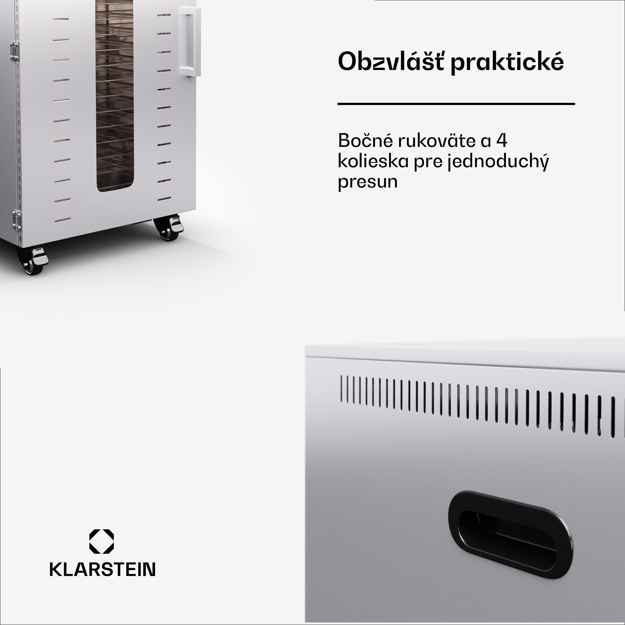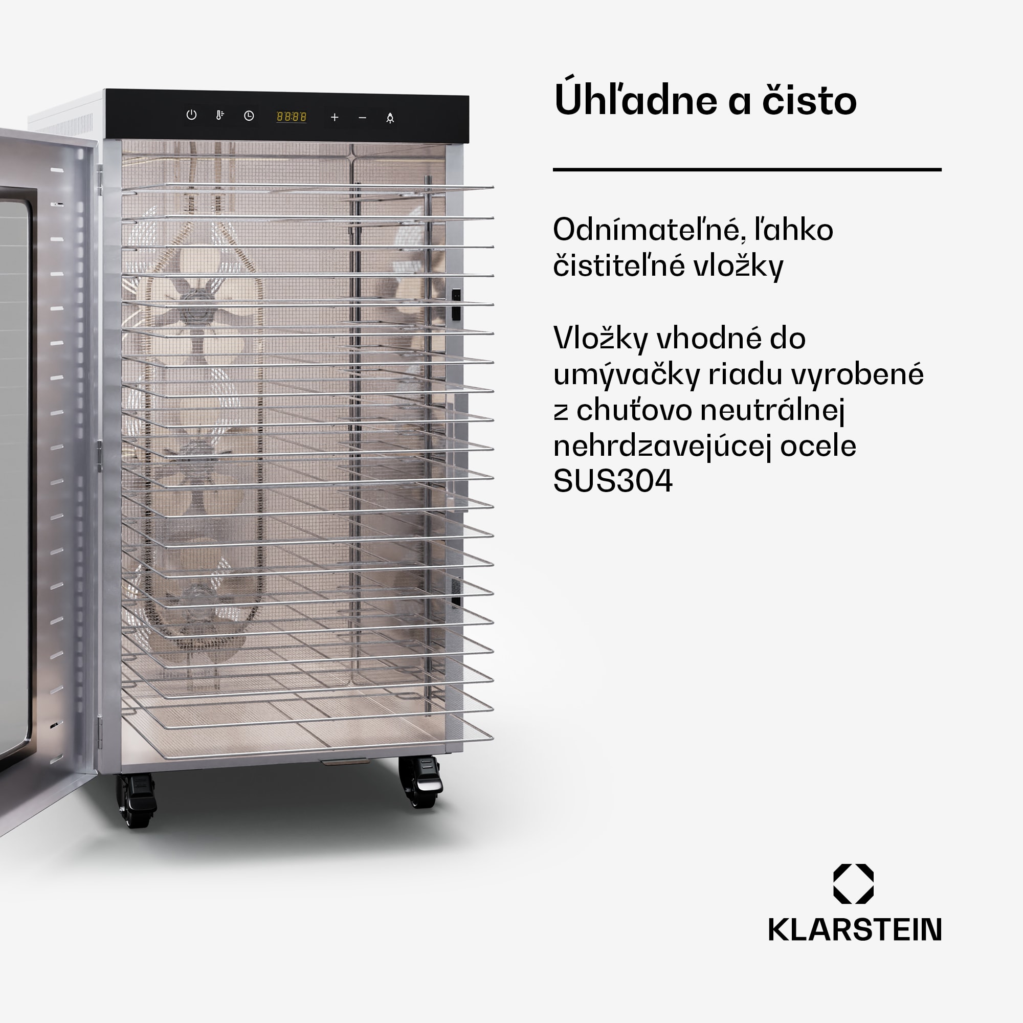 Výkonná sušička potravín Klarstein MasterJerky 300 suší ovocie, zeleninu, mäso a ďalšie potraviny rekordnou rýchlosťou. To znamená, že si môžete sami pripraviť chutné občerstvenie a prísady s dlhou životnosťou za krátky čas. Či už sušené ovocie bohaté na vitamíny, ako sú jablkové a banánové lupienky, alebo zdravá zelenina, ako sú sušené paradajky. Master Jerky 300 má pre každú potravinu tú správnu teplotu sušenia.Sušička MasterJerky 300 s obrovským tepelným výkonom 2 000 W a rovnomernou distribúciou tepla vďaka 3 ventilátorom zabezpečuje optimálne sušenie potravín a krátku dobu sušenia. Každá z 20 odnímateľných políc z nehrdzavejúcej ocele ponúka priestor s rozmermi 40 x 38 cm pre celkovú plochu až 3,04 m². Ideálne podmienky na profesionálne sušenie, napr. v špecializovaných obchodoch na sušené hovädzie mäso, čaje alebo sušené ovocie. Pre flexibilnú prípravu rôznych jedál je možné na dotykovom ovládacom paneli nastaviť teplotu od 30 do 90 °C. Časovač do 24 hodín tiež zaručuje optimálne zladenie s vlastnosťami potravín, ktoré sa majú sušiť.Vďaka plne automatickému procesu sušenia s presným dodržiavaním teploty všetko funguje perfektne. Dôležité živiny a vitamíny sa zachovajú a chuť sa ešte zvýrazní. MasterJerky 300 je samozrejme vhodná aj na výrobu sušených kvetov do aranžmánov alebo na šetrnú extrakciu sušených bylín a čajov.Čistenie sušičky Klarstein MasterJerky 300 po dokončení procesu sušenia je úplne jednoduché: odkvapkávacie misky a vložky z nehrdzavejúcej ocele možno jednoducho opláchnuť alebo vyčistiť v umývačke riadu. Kryt z nehrdzavejúcej ocele sa jednoducho utiera a vďaka kolieskam sa dá ľahko premiestňovať.