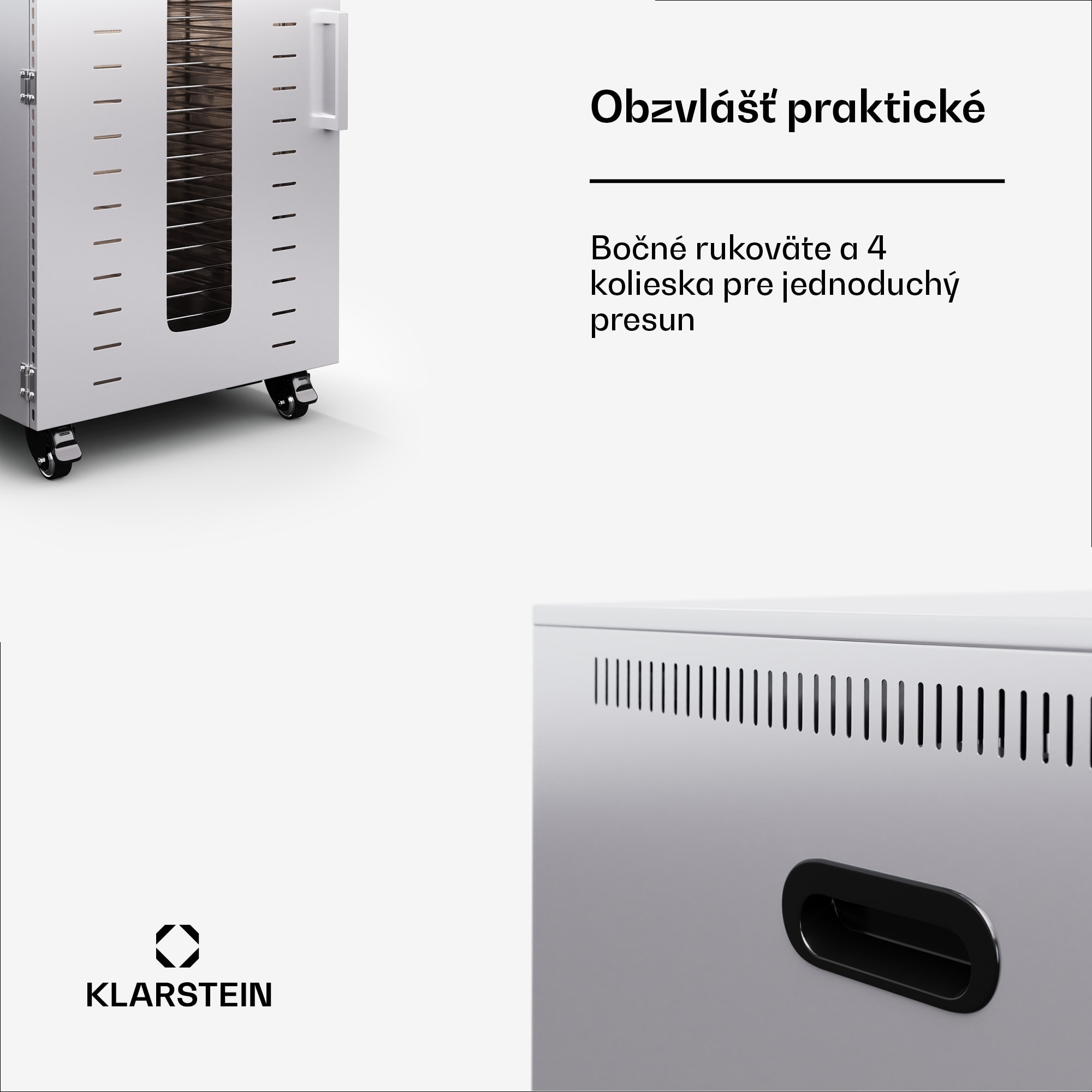 Výkonná sušička Klarstein MasterJerky 350 suší ovocie, zeleninu, mäso a ďalšie potraviny rekordnou rýchlosťou. To znamená, že si môžete sami pripraviť chutné občerstvenie a prísady s dlhou životnosťou za krátky čas. Či už sušené ovocie bohaté na vitamíny, ako sú jablkové a banánové lupienky, alebo zdravá zelenina, ako sú sušené paradajky. Master Jerky 350 má pre každú potravinu tú správnu teplotu sušenia.Sušička potravín MasterJerky 350 s obrovským tepelným výkonom 2 000 W a rovnomernou distribúciou tepla vďaka 3 ventilátorom zabezpečuje optimálne sušenie potravín a krátku dobu sušenia. Každá z 24 odnímateľných políc z nehrdzavejúcej ocele ponúka priestor s rozmermi 40 x 38 cm pre celkovú plochu až 3,65 m². Ideálne podmienky na profesionálne sušenie, napr. v špecializovaných obchodoch na sušené hovädzie mäso, čaje alebo sušené ovocie. Pre flexibilnú prípravu rôznych jedál je možné na dotykovom ovládacom paneli nastaviť teplotu od 30 do 90 °C. Časovač do 24 hodín tiež zaručuje optimálne zladenie s vlastnosťami potravín, ktoré sa majú sušiť.Vďaka plne automatickému procesu sušenia s presným dodržiavaním teploty všetko funguje perfektne. Dôležité živiny a vitamíny sa zachovajú a chuť sa ešte zvýrazní. MasterJerky 350 je samozrejme vhodná aj na výrobu sušených kvetov do aranžmánov alebo na šetrnú extrakciu sušených bylín a čajov.Čistenie sušičky Klarstein MasterJerky 350 po dokončení procesu sušenia je úplne jednoduché: odkvapkávacie misky a vložky z nehrdzavejúcej ocele možno jednoducho opláchnuť alebo vyčistiť v umývačke riadu. Kryt z nehrdzavejúcej ocele sa jednoducho utiera a vďaka kolieskam sa dá ľahko premiestňovať.