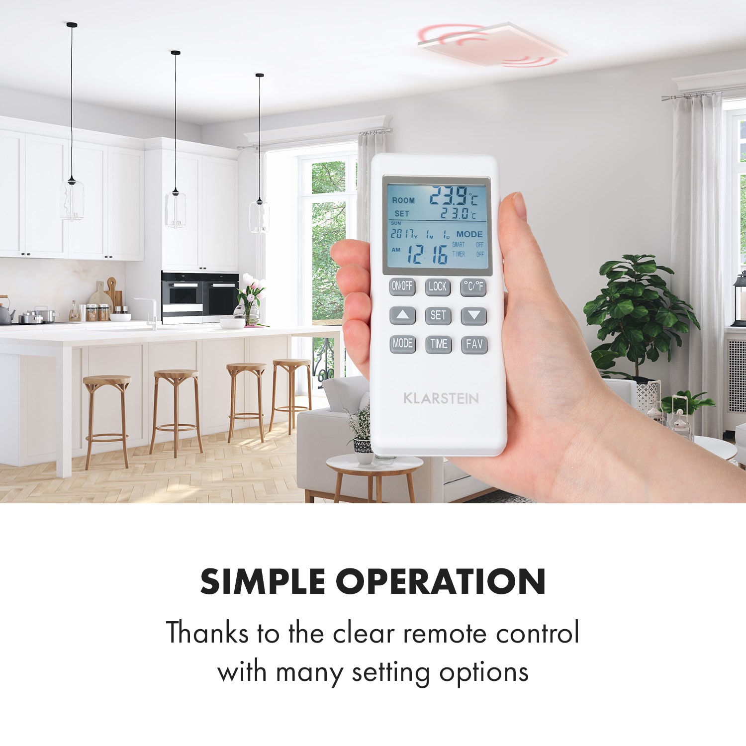 Akoby vašu izbu zohrievalo slnko: Infračervený ohrievač Klarstein Midnight Sun vytvára príjemné teplo vysoko efektívnym a priestorovo úsporným spôsobom a obohatí každú miestnosť o atmosférické dekoratívne LED osvetlenie. Stropný infračervený ohrievač Klarstein Midnight Sun predstavuje revolúciu vo vykurovaní pomocou modernej technológie. Veľmi plochý a nenápadný vyhrievací panel s hliníkovým krytom môžete namontovať priamo na strop. Tento infrapanel s výkonom 350 W využíva princíp solárneho tepla s IR ComfortHeat: Namiesto pomalého ohrievania vzduchu vyžaruje príjemné infračervené lúče. Tie okamžite ohrievajú osoby a predmety v účinnej oblasti približne 7 m². Vďaka praktickým funkciám, ako je ochrana proti prehriatiu, OpenWindow Detection, , ktorá automaticky vypína alebo zapína vyhrievanie, a programovateľnému týždennému časovaču je toto revolučné kúrenie dokonalé. Atmosférické a príjemné teplo: Inovatívny stropný infračervený ohrievač Klarstein Midnight Sun rozžiari každú miestnosť a okamžite vás pohladí zdravým infračerveným teplom.