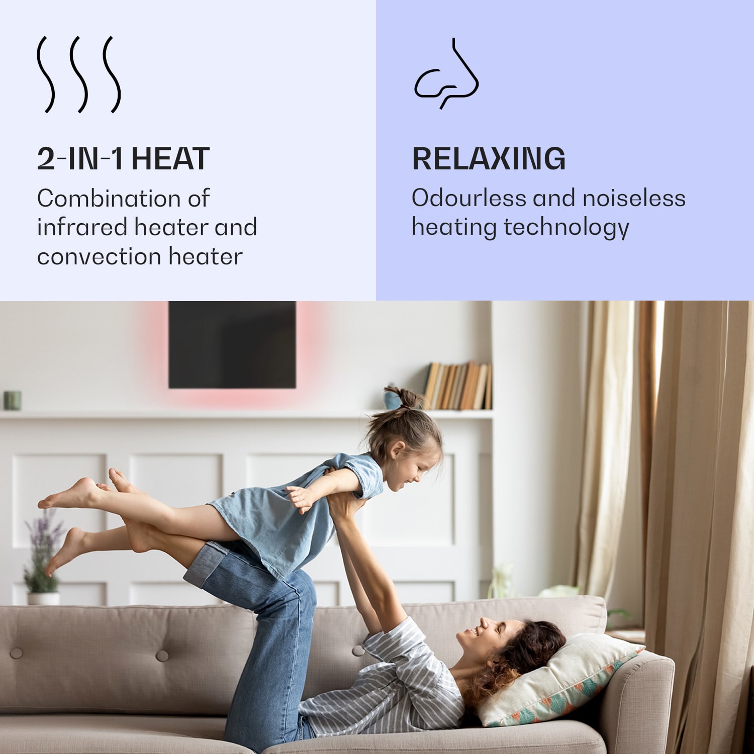 Dvojitý výkon pri rovnakej veľkosti, Klarstein Mojave ohrievače 2 v 1 šikovne kombinujú infračervený sálavý ohrievač s konvektorom a tým nielen rýchlo vytvárajú citeľné infračervené teplo v priestorovo úspornom dizajne, ale vytvárajú aj príjemne teplý vzduch v miestnosti prostredníctvom tepla stúpajúceho zo zadnej strany. V závislosti od veľkosti miestnosti si môžete vybrať ohrievač s výkonom 500, 750, alebo 1000 W. Termostat, ktorý možno nastaviť v stupňoch, a týždenný časovač sa ovládajú veľmi inteligentne prostredníctvom aplikácie Klarstein alebo diaľkovým ovládaním. Vďaka ochrannej triede IP44 sú konvektory ideálne aj do kúpeľne. Nezáleží na tom, kam zavesíte svoj nový vykurovací panel Klarstein Mojave Smart, so svojím farebným ambientným svetlom RGB vytvorí tú správnu atmosféru, nech ste kdekoľvek.