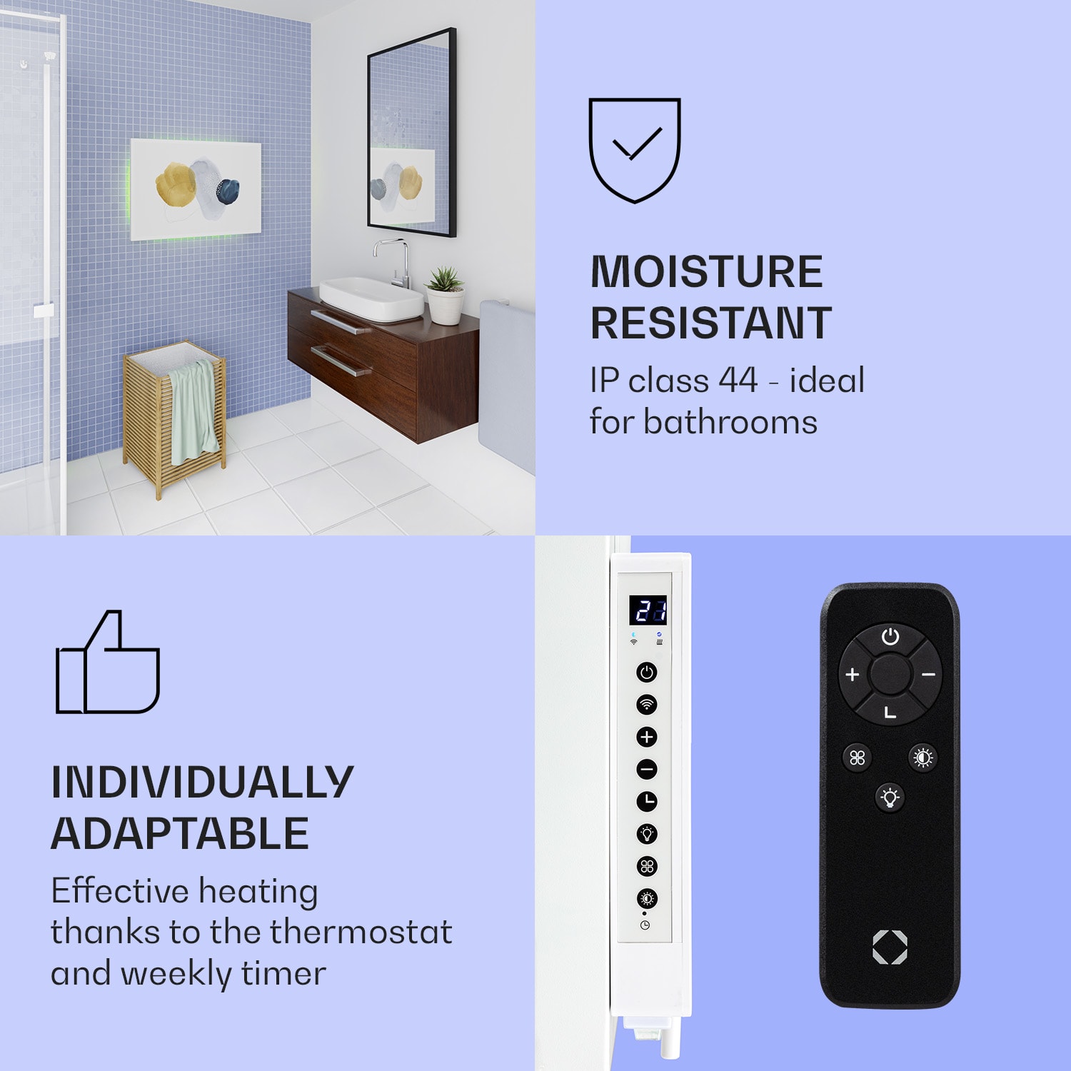 Dvojitý výkon pri rovnakej veľkosti, Klarstein Mojave ohrievače 2 v 1 šikovne kombinujú infračervený sálavý ohrievač s konvektorom a tým nielen rýchlo vytvárajú citeľné infračervené teplo v priestorovo úspornom dizajne, ale vytvárajú aj príjemne teplý vzduch v miestnosti prostredníctvom tepla stúpajúceho zo zadnej strany. V závislosti od veľkosti miestnosti si môžete vybrať ohrievač s výkonom 500, 750, alebo 1000 W. Termostat, ktorý možno nastaviť v stupňoch, a týždenný časovač sa ovládajú veľmi inteligentne prostredníctvom aplikácie Klarstein alebo diaľkovým ovládaním. Vďaka ochrannej triede IP44 sú konvektory ideálne aj do kúpeľne. Nezáleží na tom, kam zavesíte svoj nový vykurovací panel Klarstein Mojave Smart, so svojím farebným ambientným svetlom RGB vytvorí tú správnu atmosféru, nech ste kdekoľvek.
