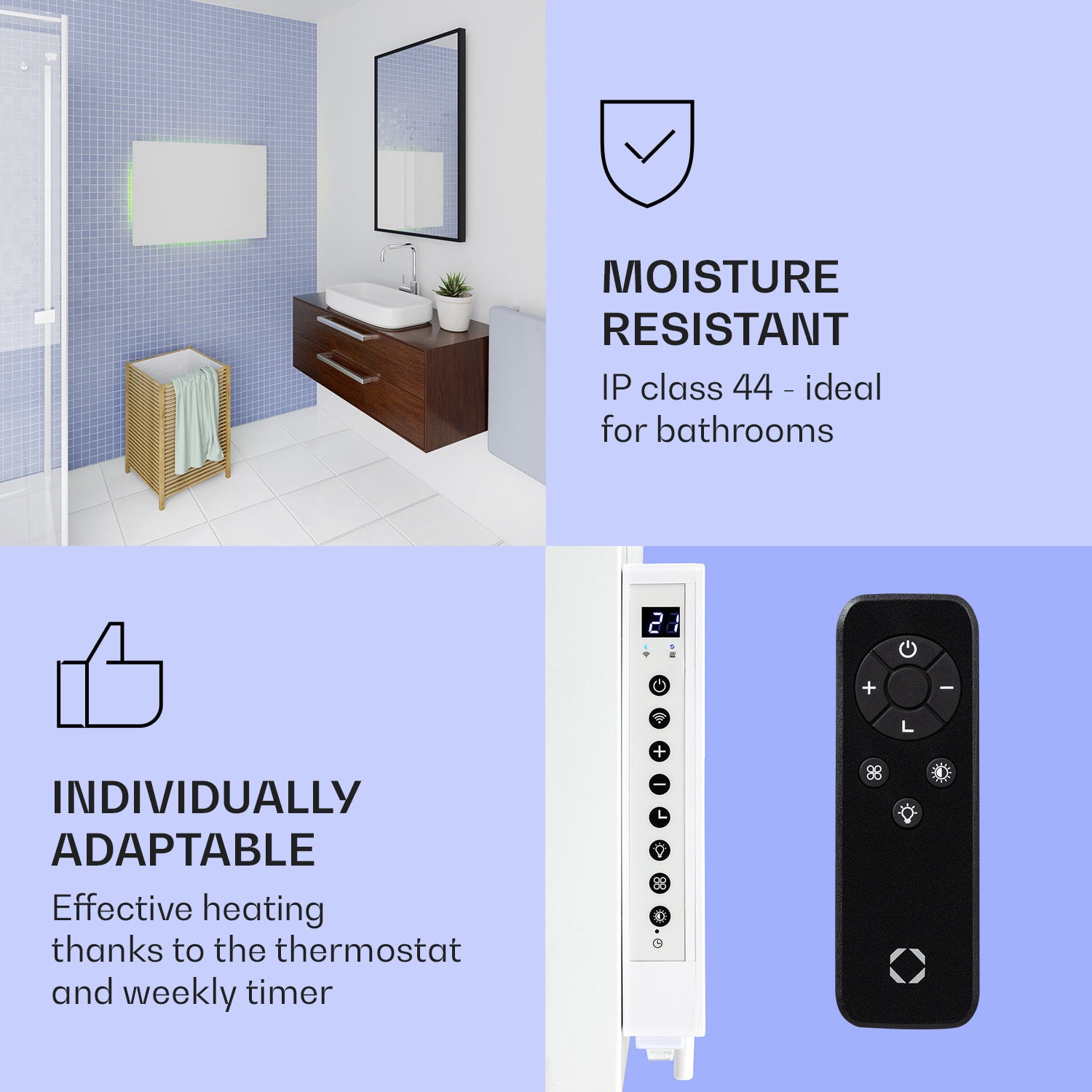 Dvojitý výkon pri rovnakej veľkosti, Klarstein Mojave ohrievače 2 v 1 šikovne kombinujú infračervený sálavý ohrievač s konvektorom a tým nielen rýchlo vytvárajú citeľné infračervené teplo v priestorovo úspornom dizajne, ale vytvárajú aj príjemne teplý vzduch v miestnosti prostredníctvom tepla stúpajúceho zo zadnej strany. V závislosti od veľkosti miestnosti si môžete vybrať ohrievač s výkonom 500, 750, alebo 1000 W. Termostat, ktorý možno nastaviť v stupňoch, a týždenný časovač sa ovládajú veľmi inteligentne prostredníctvom aplikácie Klarstein alebo diaľkovým ovládaním. Vďaka ochrannej triede IP44 sú konvektory ideálne aj do kúpeľne. Nezáleží na tom, kam zavesíte svoj nový vykurovací panel Klarstein Mojave Smart, so svojím farebným ambientným svetlom RGB vytvorí tú správnu atmosféru, nech ste kdekoľvek.