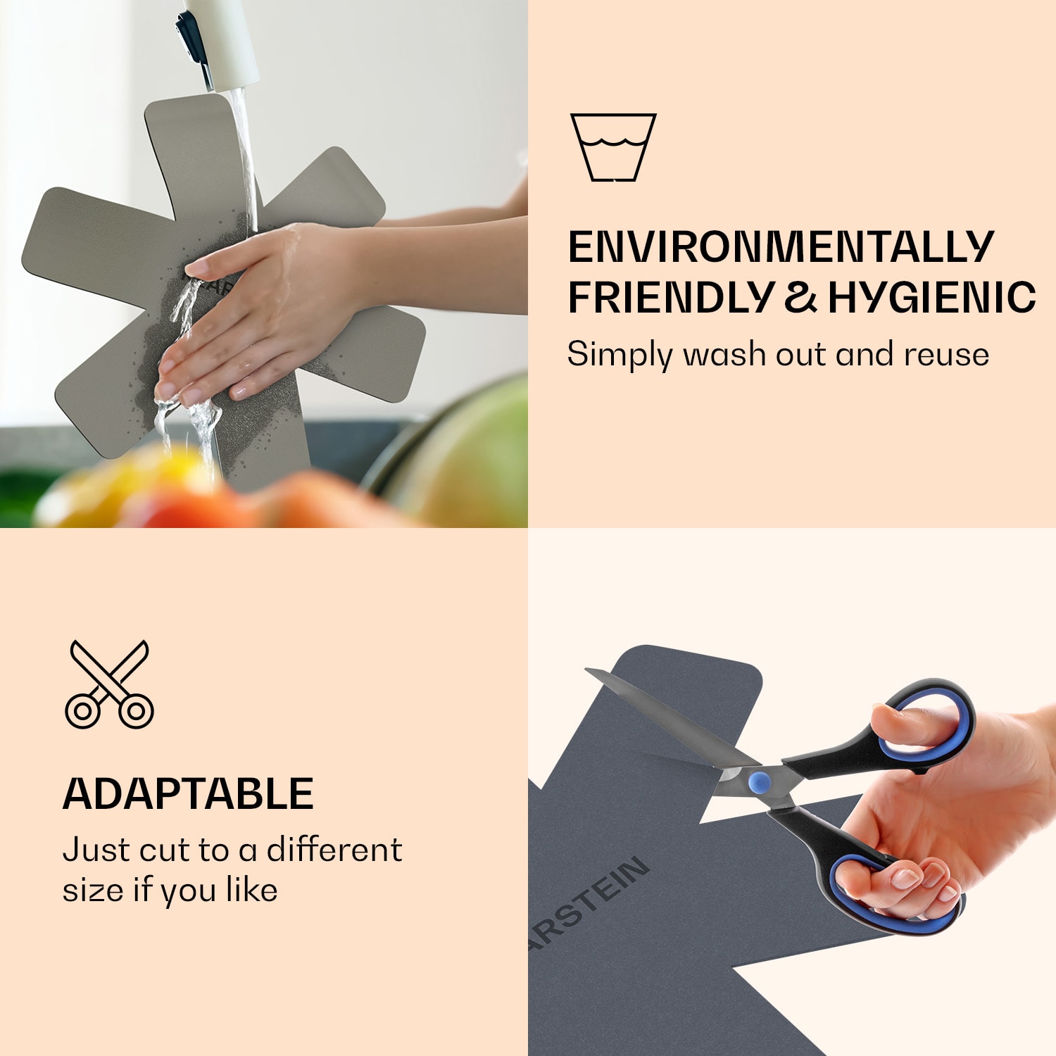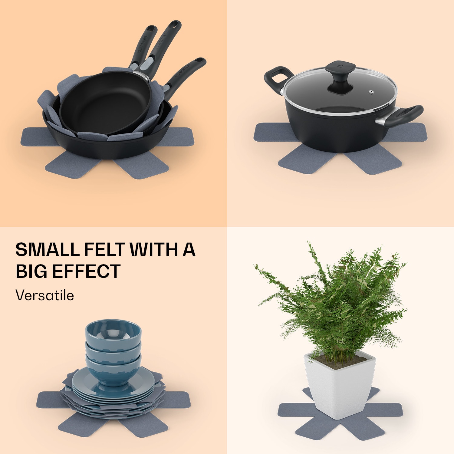 Pre dlhšiu radosť z vašich hrncov a panvíc Klarstein Noto Endurance: Dômyselná súprava plstených chráničov Noto Endurance vám poskytne päť praktických chráničov, ktoré sú ideálne na ukladanie hrncov a panvíc v skrini. Jednotlivé chrániče jednoducho umiestnite medzi kuchynský riad, aby ste zabránili poškriabaniu povrchu a spodnej strany. Plstené chrániče Noto Endurance od Klarstein však môžete použiť aj ako podložky pod hrnce a panvice. Chránia tak akýkoľvek stôl, povrch alebo pracovnú dosku, vždy keď položíte hrniec alebo panvicu na plsť . Použitie každého jednotlivého chrániča je veľmi variabilné a vďaka priemeru 38 cm a flexibilnému strihu v tvare hviezdy vám ponúka veľa možností. Plstený chráničmôžete tiež ľahko zastrihnúť nožnicami na menšiu veľkosť.So súpravou chráničov Klarstein Noto Endurance môžete stohovať riad bez obáv, pretože mäkké vložky ho chránia pred poškriabaním!