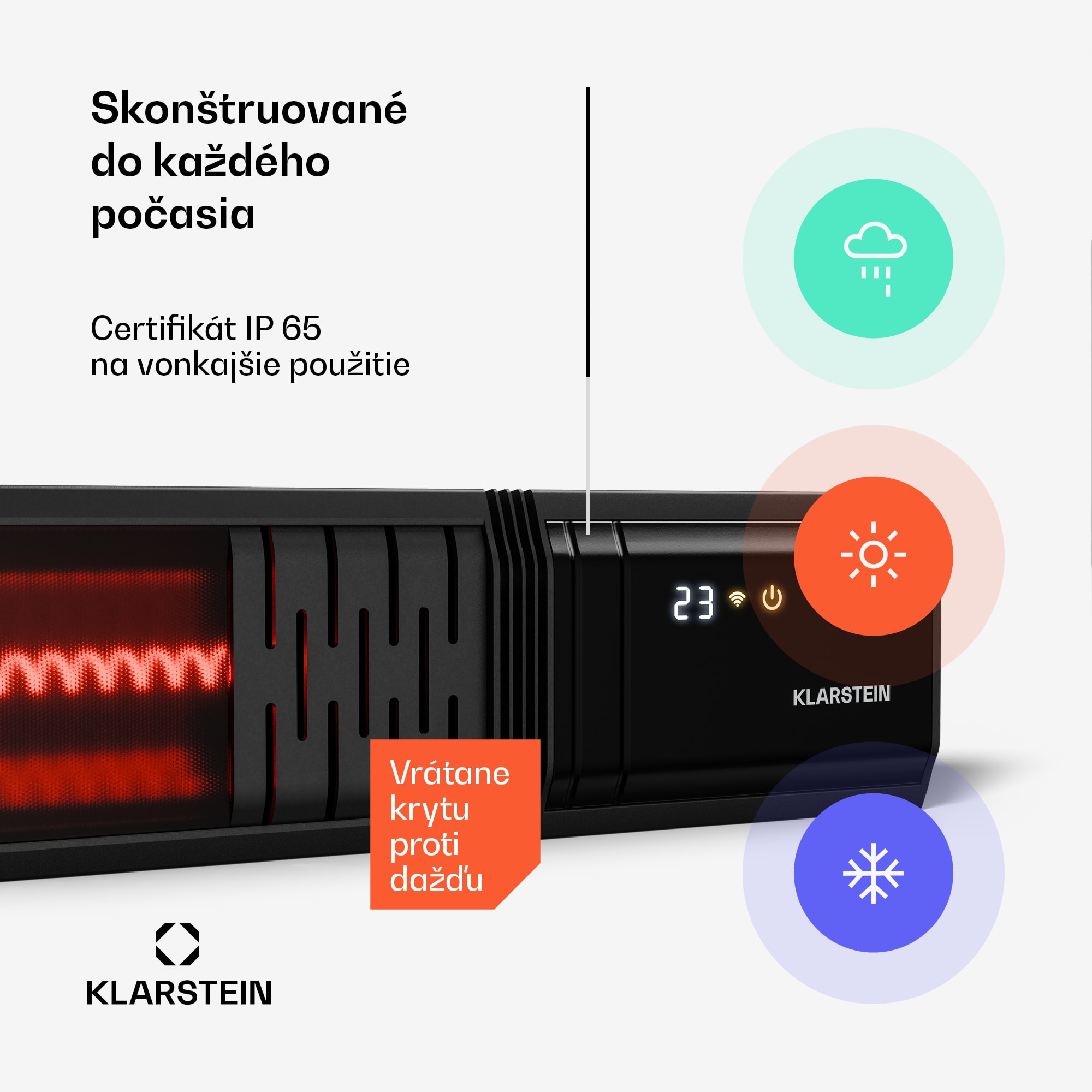 Nástenný infračervený ohrievač Klarstein Phantom kombinuje štíhly, funkčný dizajn s účinnosťou, vysokým výkonom a jednoduchou obsluhou.Vykuruje vonkajšie priestory s rozlohou až 15 m² s výkonom 2000 W. Infračervený ohrievač pracuje efektívne a ticho. Ovláda sa buď stlačením tlačidla, pomocou diaľkového ovládača, cez aplikáciu Klarstein alebo pomocou digitálnych asistentov, ako sú Amazon Alexa a Google Home.Možno ho nainštalovať na stenu pomocou dodaného držiaka. To znamená, že infračervený ohrievač možno inštalovať priestorovo úsporne a prispôsobiť ho koncepcii miestnosti.Časovač tiež zaručuje efektívnu prevádzku prispôsobené vášmu dennému rytmu.