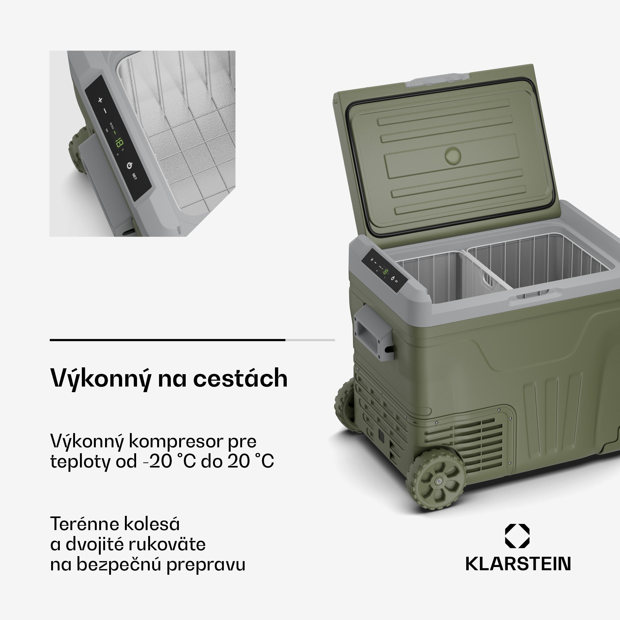 Kompresorový chladiaci box Klarstein PolarForce 50L je ideálnym spoločníkom na všetky vaše dobrodružstvá – či už ide o kempovanie, výlety, plavby loďou alebo dlhé cesty autom. Tento prenosný chladiaci box s veľkorysým objemom 50 litrov ponúka dostatok priestoru na uskladnenie rôznych potravín a nápojov. Vďaka výkonnej kompresorovej technológii môže chladiaci box dosiahnuť teplotu od -20 °C do 20 °C, takže vaše zásoby zostanú vždy optimálne chladené alebo zmrazené.Integrovaný ovládací LCD panel umožňuje jednoduchú a presnú reguláciu teploty, zatiaľ čo dva vyberateľné koše a priehradka uľahčujú organizáciu a prístup k potravinám. Kompresorový chladiaci box Klarstein PolarForce 50L je vybavený robustnými terénnymi kolesami a dvojitými rukoväťami, vďaka čomu sa ľahko prepravuje aj v náročnom teréne. Má tiež trojstupňové monitorovanie batérie, ktoré chráni batériu vozidla pred preťažením a vybitím.Či už v aute, na lodi alebo doma – vďaka svojej všestrannosti a výkonu je kompresorový chladiaci box Klarstein PolarForce 50L ideálnym riešením pre každého, kto sa na cestách nechce zaobísť bez čerstvých potravín.Poznámka: Pred prvým použitím nechajte chladiaci box 24 hodín vo zvislej polohe.