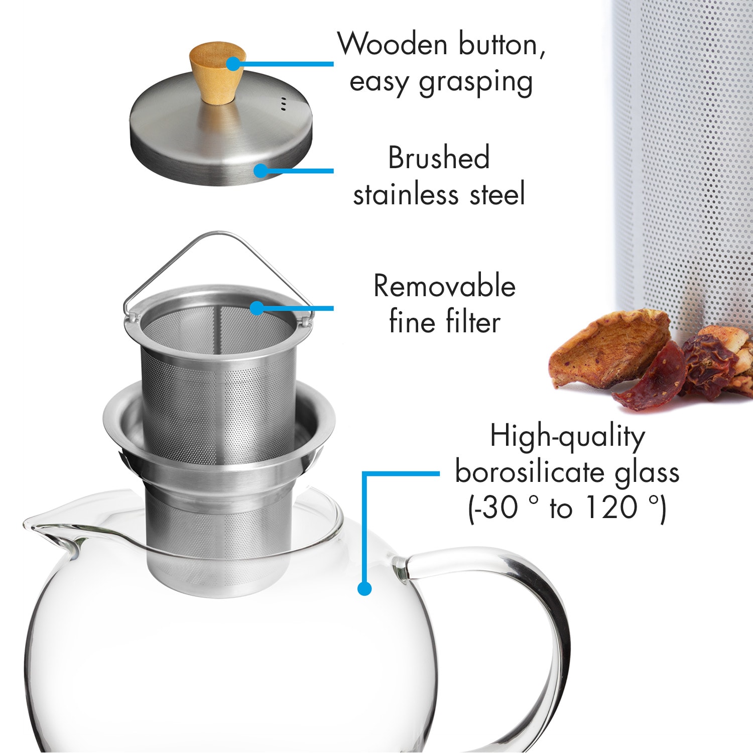 Klarstein Sencha, kanvica na čaj, 1,3 l, sitko z nehrdzavejúcej ocele, borosilikátové sklo, vrchnák
