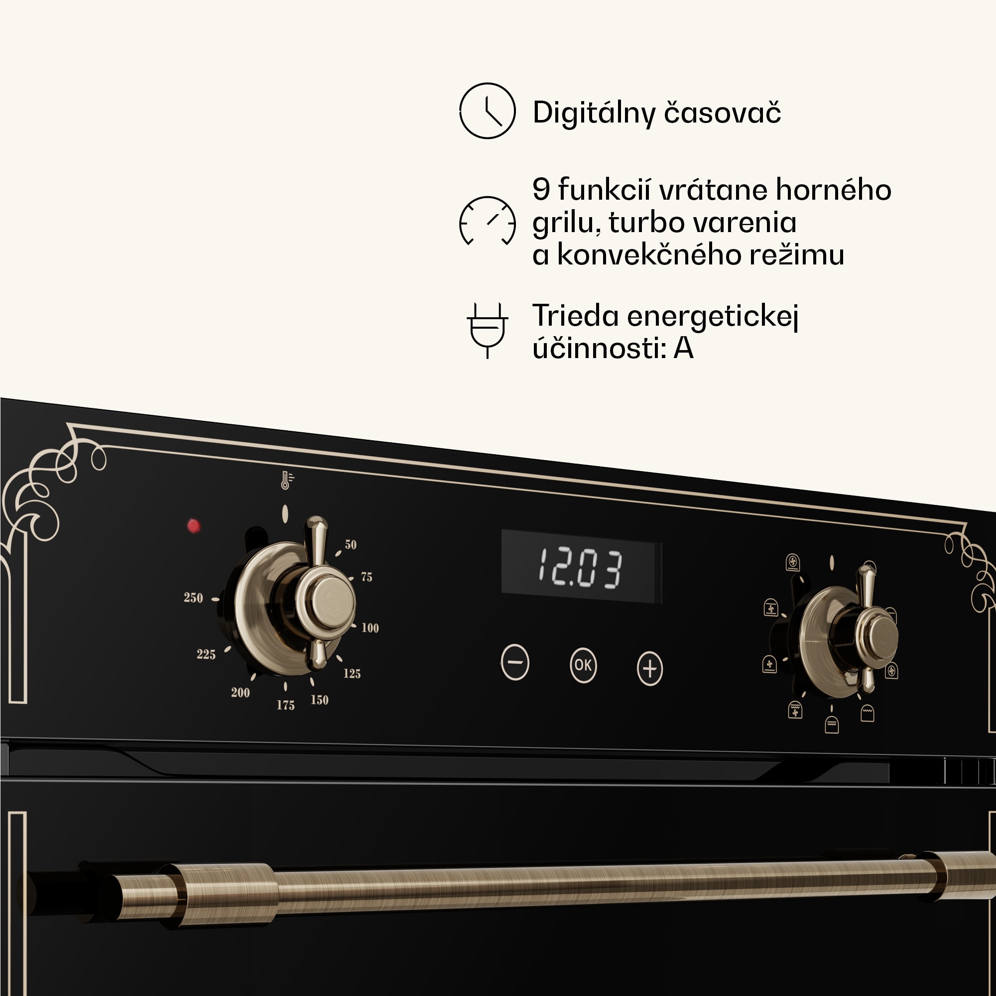 Sklokeramická varná doska a úzka rúra Klarstein Victoria kombinujú retro dizajn s vysokým výkonom a modernou technológiou. So svojimi zlatými, viktoriánsky inšpirovanými detailmi prinášajú do vašej kuchyne vintage nádych. Ako súčasť dizajnovej série Victoria stelesňuje táto varná doska a rúra nadčasové čaro, vďaka čomu sú prirodzenými stredobodmi každej kuchyne. Tri výkonné, vysokokvalitné varné zóny s celkovým výkonom 5000 W zaručujú plynulé varenie. Vďaka dotykovému posuvníku sa varná doska ľahko a intuitívne obsluhuje a jej bezpečnú prevádzku zaručuje detská poistka a ukazovateľ zvyškového tepla. Štíhla rúra bez kompromisov vo výkone a funkciách má 49-litrovú smaltovanú varnú komoru s pochrómovanými policami a vodidlami, ktoré zaručujú dlhodobú účinnosť. Čistenie je mimoriadne jednoduché vďaka odnímateľným skleneným dvierkam a funkcii čistenia parou. Digitálny časovač a 10 funkcií vrátane grilovania zhora, turbo grilovania a grilovania s ventilátorom zabezpečujú presnosť prípravy pokrmov. Chceli by ste si zariadiť celú kuchyňu s eleganciou inšpirovanou viktoriánskym štýlom? Objavte všetky naše spotrebiče Victoria a vytvorte si nadčasovú, harmonickú kuchyňu!