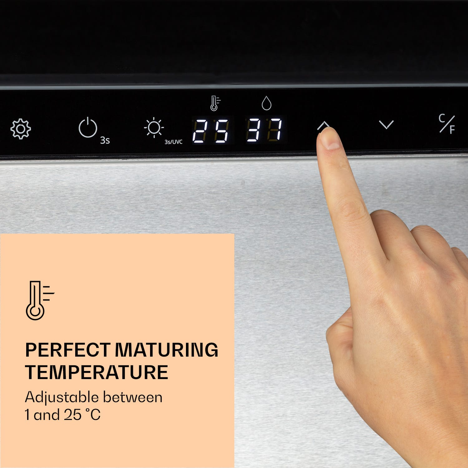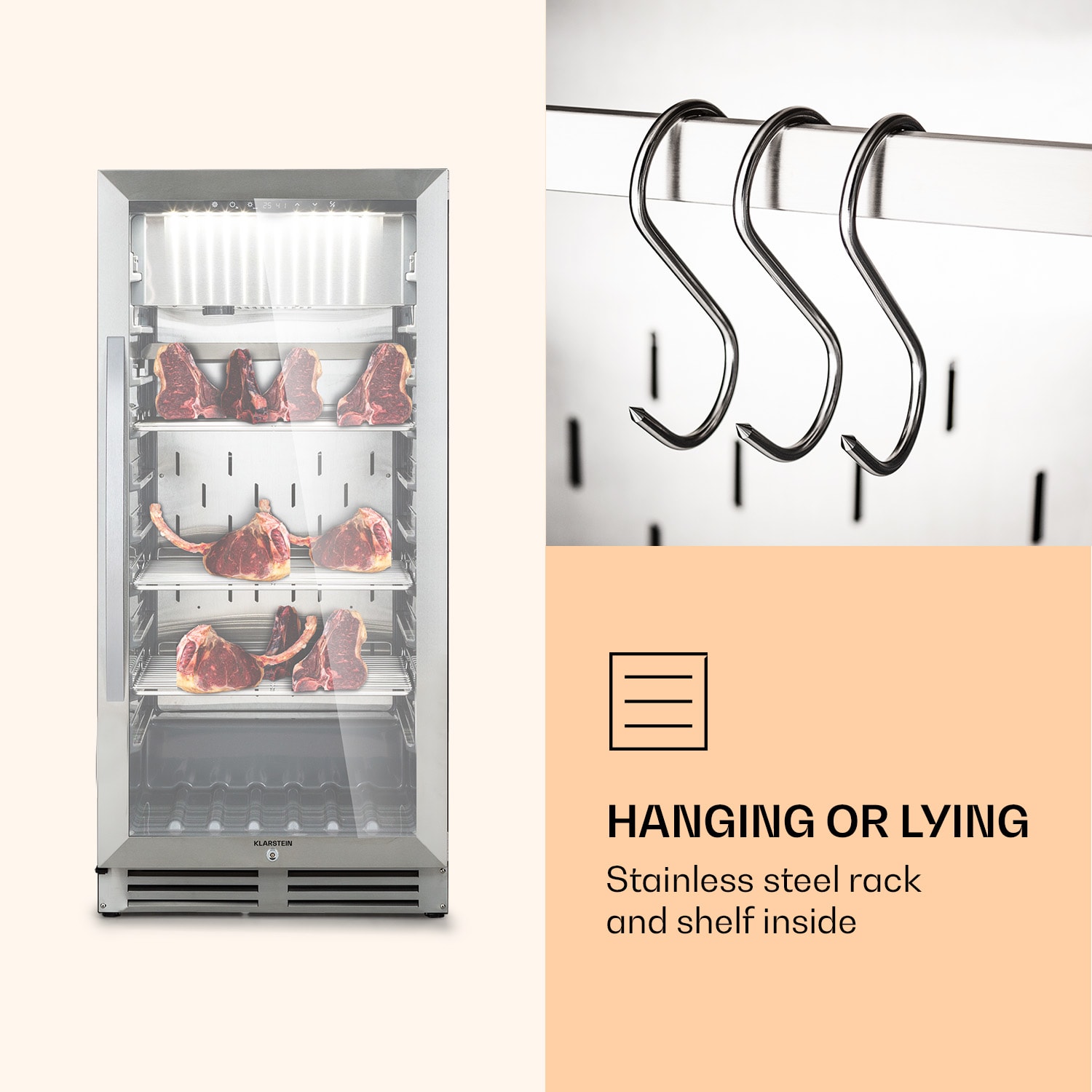 Tá správna zrelosť pre skutočný chuťový zážitok: v chladničke na zrenie mäsa Steakhouse Pro 233 od Klarstein zreje nielen mäso na steaky, ale aj saláma, šunka alebo suché bravčové mäso. Suché zrenie je jednou z najstarších a najosvedčenejších metód zušľachťovania mäsa. Vďaka chladničke na zrenie mäsa Steakhouse Pro 233 je táto metóda jednoducho dostupná. Špičková kvalita klobás či mäsa sa zušľachtí v tých najlepších podmienkach. Integrovaný systém UVC zabezpečuje antibakteriálnu čistotu vo vnútri. Všetky nastavenia vykonáte jednoducho pomocou dotykového ovládacieho panela a proces zrenia prebieha v prístroji automaticky. Zapínateľné LED osvetlenie navyše vhodne prezentuje obsah chladničky. Práve to robí z chladničky na zrenie Steakhouse Pro 233 od Klarstein perfektné zariadenie na reprezentatívne vybavenie reštaurácií alebo lokálnych obchodov.