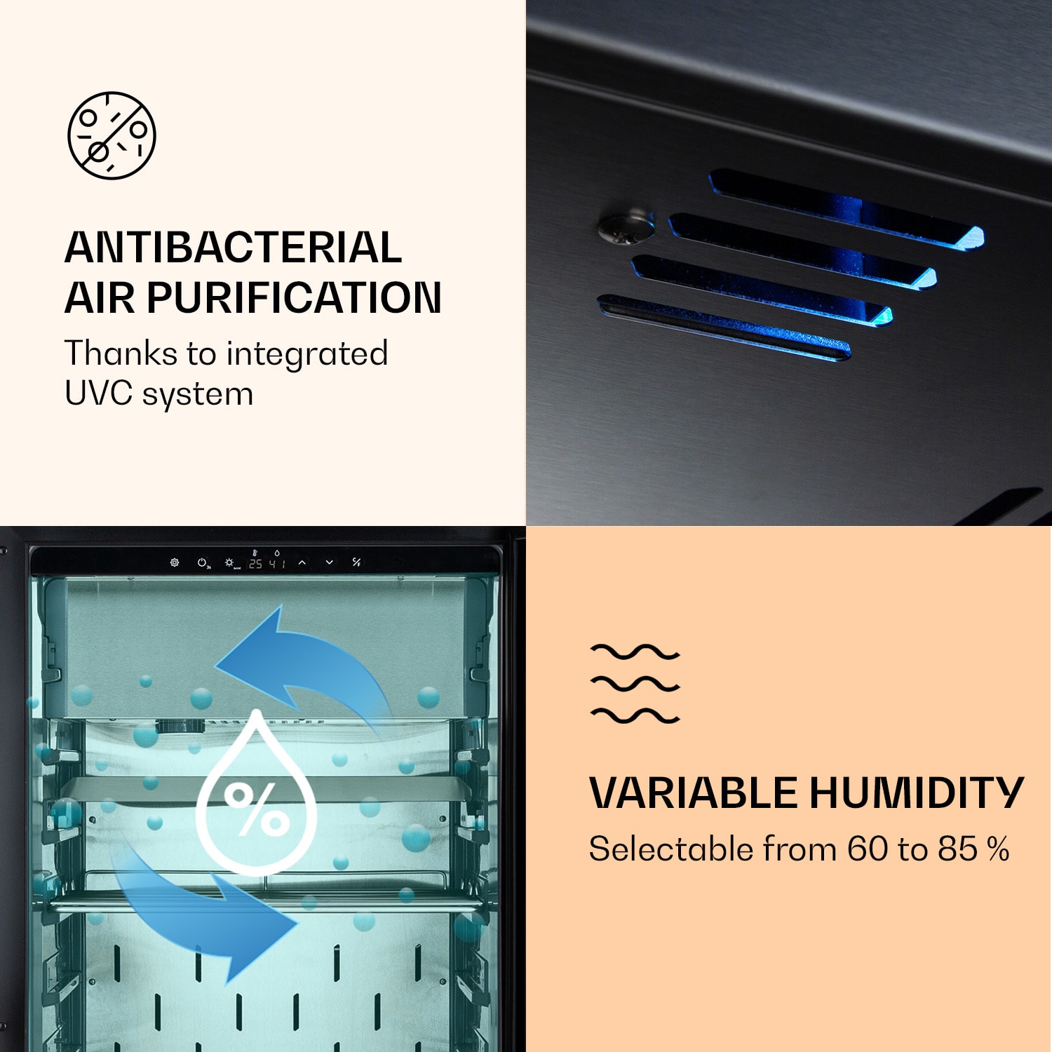 Tá správna zrelosť pre skutočný chuťový zážitok: v chladničke na zrenie mäsa Steakhouse Pro 233 od Klarstein zreje nielen mäso na steaky, ale aj saláma, šunka alebo suché bravčové mäso. Suché zrenie je jednou z najstarších a najosvedčenejších metód zušľachťovania mäsa. Vďaka chladničke na zrenie mäsa Steakhouse Pro 233 je táto metóda jednoducho dostupná. Špičková kvalita klobás či mäsa sa zušľachtí v tých najlepších podmienkach. Integrovaný systém UVC zabezpečuje antibakteriálnu čistotu vo vnútri. Všetky nastavenia vykonáte jednoducho pomocou dotykového ovládacieho panela a proces zrenia prebieha v prístroji automaticky. Zapínateľné LED osvetlenie navyše vhodne prezentuje obsah chladničky. Práve to robí z chladničky na zrenie Steakhouse Pro 233 od Klarstein perfektné zariadenie na reprezentatívne vybavenie reštaurácií alebo lokálnych obchodov.