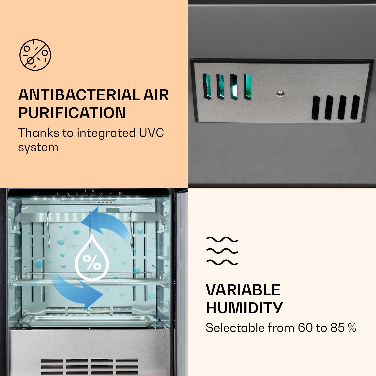 Správna zrelosť pre plný chuťový zážitok: v chladničke na zrenie mäsa Steakhouse Pro 98 Onyx od Klarstein zreje nielen mäso na steaky, ale aj saláma, šunka alebo suché bravčové mäso. Suché zrenie je jednou z najstarších a najosvedčenejších metód zušľachťovania mäsa. Vďaka chladničke na zrenie mäsa Steakhouse Pro 98 Onyx je táto metóda jednoducho dostupná. Špičková kvalita klobás a mäsa sa zušľachtí v tých najlepších podmienkach. Integrovaný systém UVC zabezpečuje antibakteriálnu čistotu vo vnútri. Všetky nastavenia vykonáte ľahko pomocou dotykového ovládacieho panela a proces zrenia prebieha v prístroji automaticky. Zapínateľné LED osvetlenie navyše prezentuje obsah chladničky. Práve to robí z chladničky na zrenie Steakhouse Pro 98 Onyx od Klarstein perfektné zariadenie na reprezentatívne vybavenie reštaurácií alebo lokálnych obchodov.