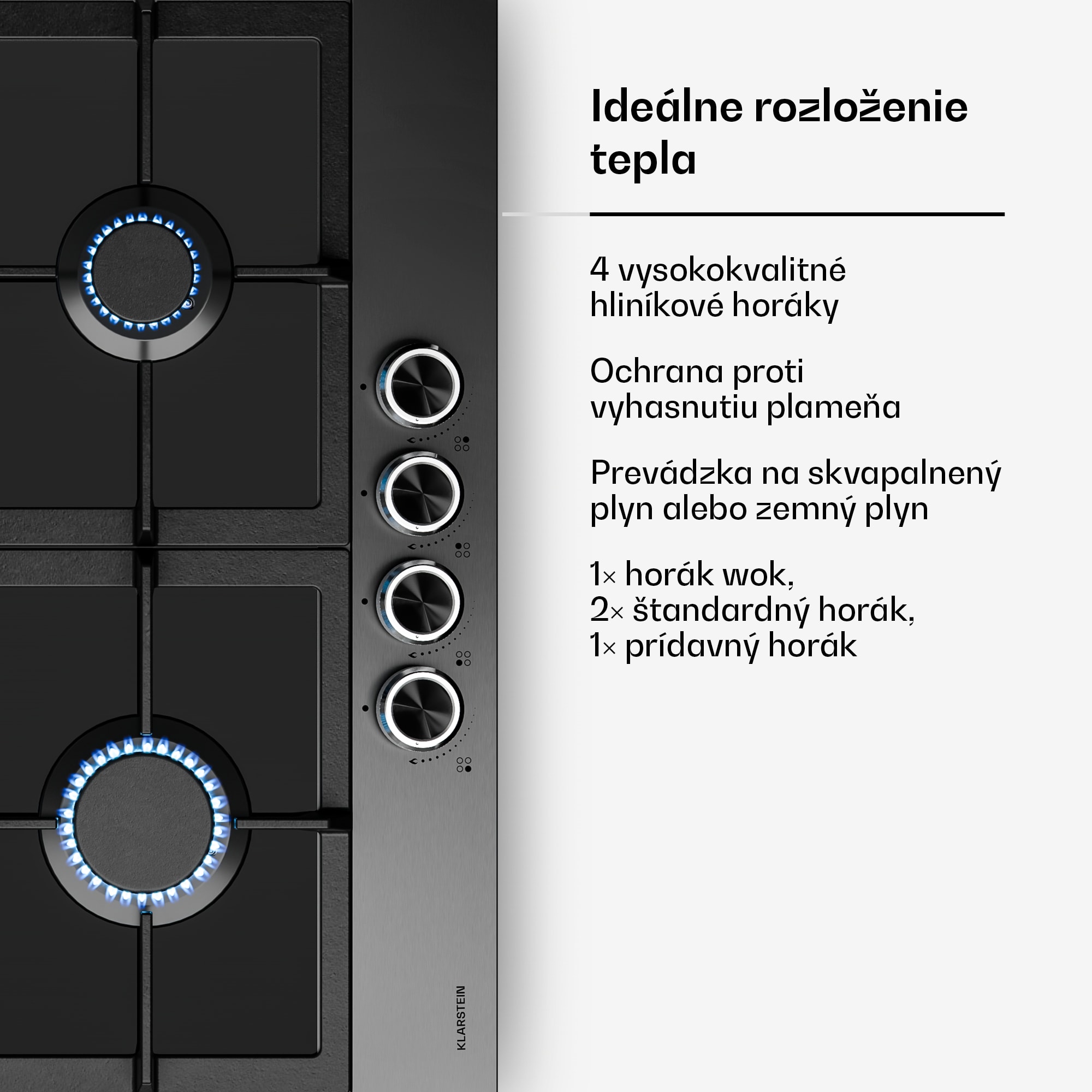Klarstein Verosteel plynová varná doska, 4 horáky, elektrické zapalovanie, kompatibilná s zemným plynom a LPG, 8000 W, 60cm