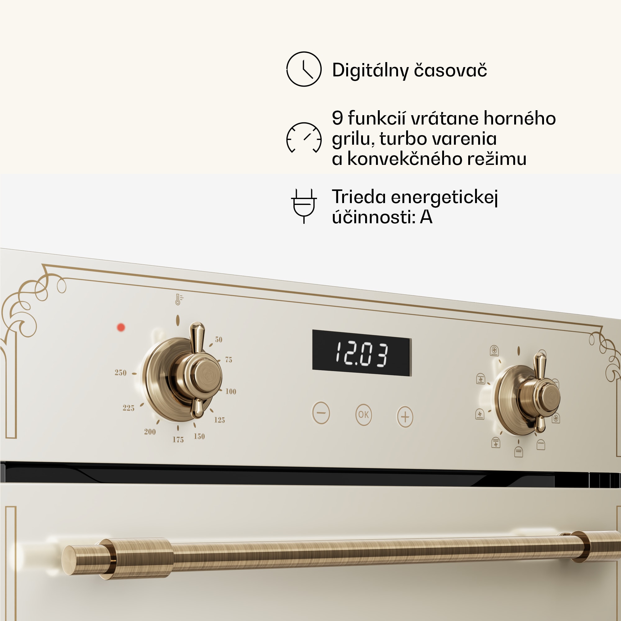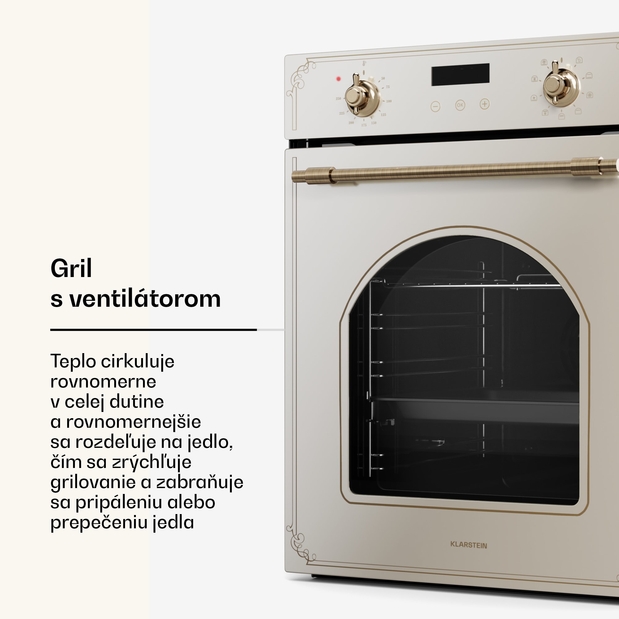 Klarstein Victoria indukčná varná doska a vstavaná rúra spájajú dizajn inšpirovaný retro štýlmi s výkonným výkonom a modernou technológiou. So svojimi zlatými, viktoriánsky inšpirovanými detailmi prinášajú do vašej kuchyne istý vintage nádych. Ako súčasť dizajnovej série Victoria tieto varná doska a rúra stelesňujú nadčasové kúzlo a sú tak prirodzeným srdcom každej kuchyne. Klarstein Victoria indukčná varná doska ponúka užívateľsky prívetivú Slider Touch Control, ktorá umožňuje presné ovládanie varných zón. Každá z 3 varných zón je vybavená výkonným Boosterom, ktorý výrazne skracuje čas varenia. Indikátor zvyškového tepla upozorňuje na horúci povrch a zabezpečuje dodatočnú bezpečnosť po varení, pričom časovač umožňuje individuálne nastavenie doby varenia pre každé jedlo. Bez kompromisov vo výkone a vybavení disponuje štíhla rúra 49-litrovou smaltovanou vnútornou časťou s chrómovanými roštami a vodičmi, ktoré zaručujú dlhodobú efektivitu. Čistenie je mimoriadne jednoduché vďaka vyberateľným skleneným dverám a funkcii parného čistenia. Digitálny časovač a 10 funkcií, vrátane horného grilu, cirkulačného pečenia a grilovania s cirkuláciou vzduchu, zabezpečujú presnosť pri príprave vašich jedál. Chcete zariadiť celú kuchyňu jednotne s viktoriánsky inšpirovanou eleganciou? Objavte teraz všetky naše Victoria spotrebiče a vytvorte nadčasovo harmonický kuchynský zážitok!