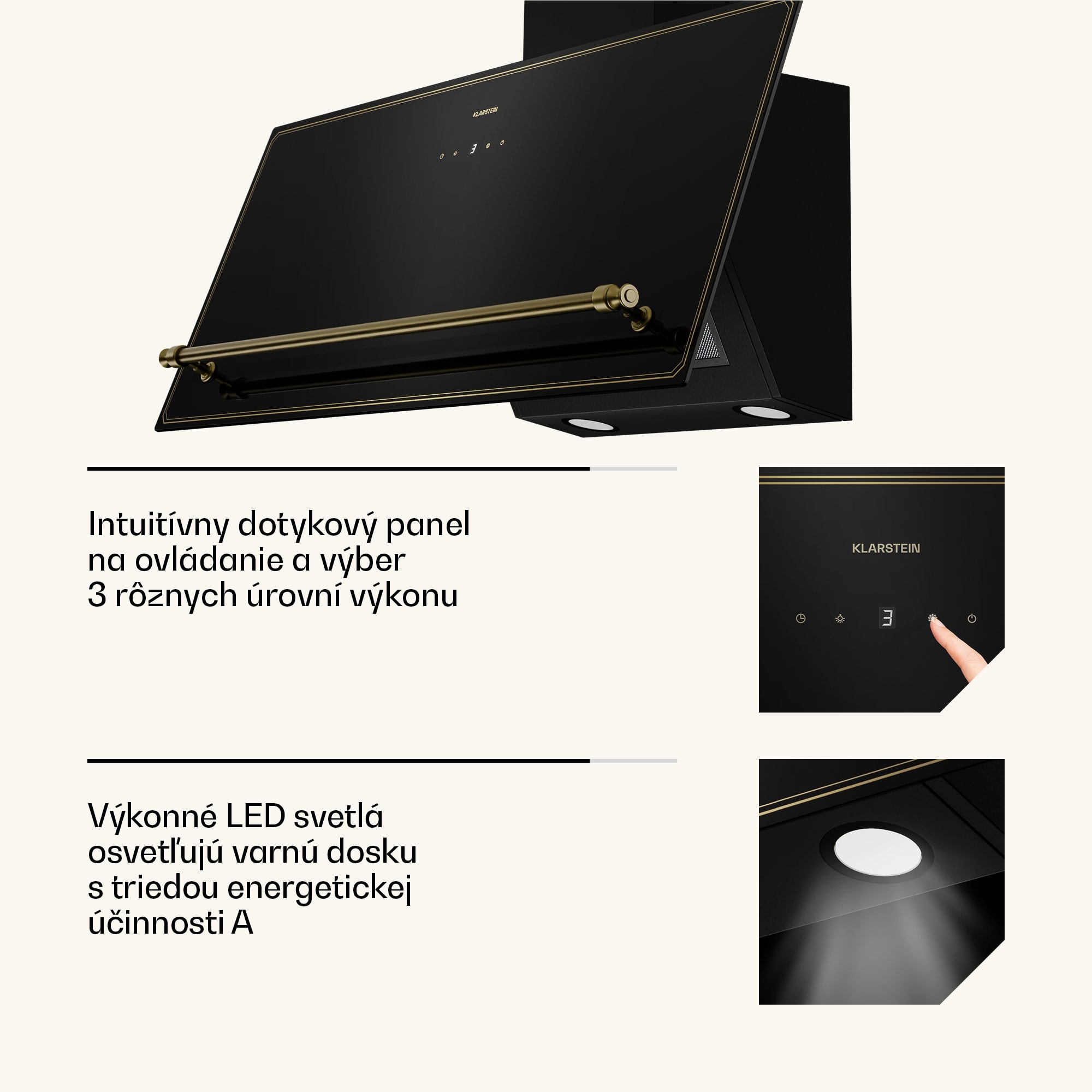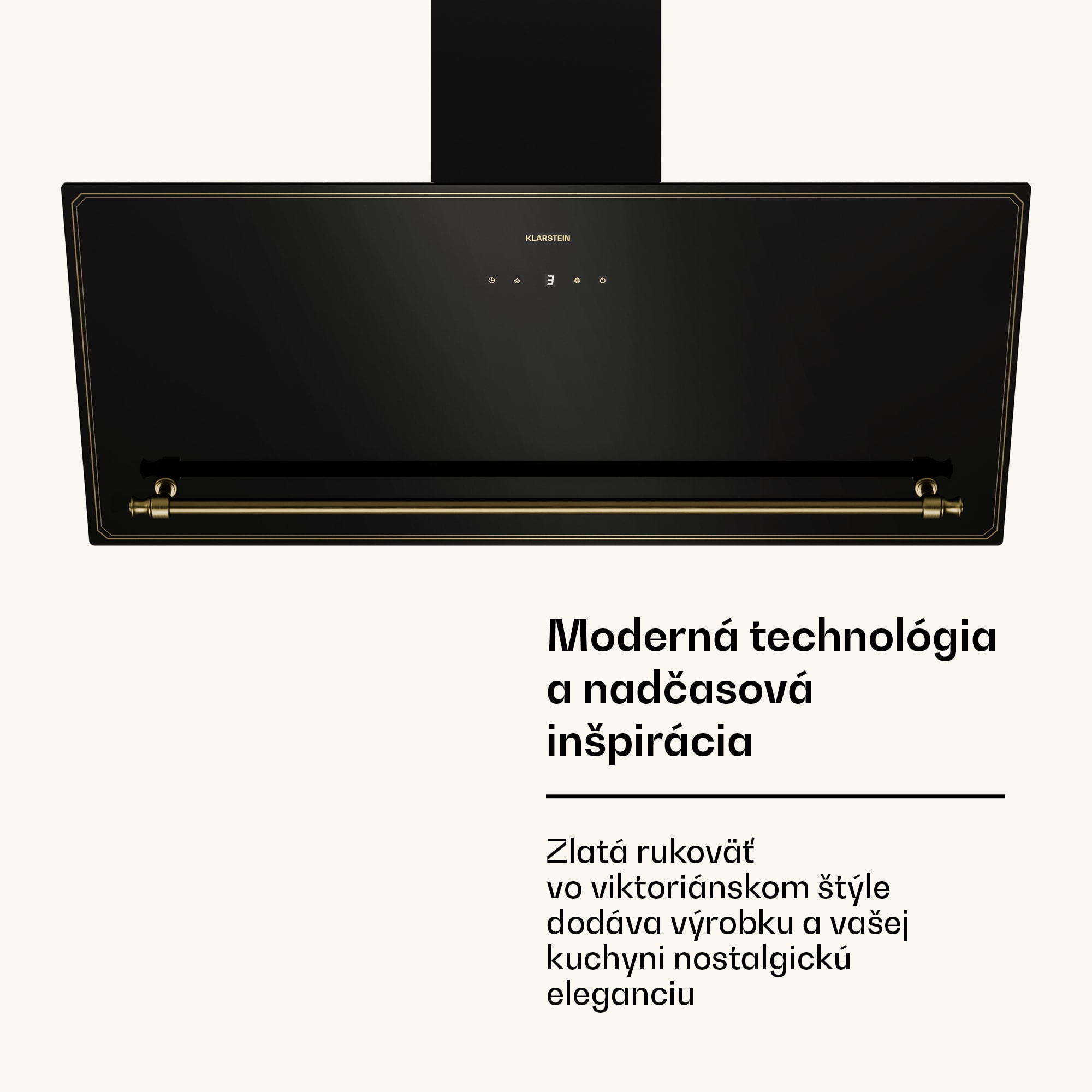 Šikmý digestor Klarstein Victoria – moderná technológia s nádychom vintage dizajnu.Prináša najmodernejšie technológie do vašej kuchyne s nádychom inej éry v sofistikovanej kombinácii čiernej a zlatej farby – nápadná zlatá rukoväť inšpirovaná viktoriánskym štýlom pozdvihuje celočierny dizajn s jemnými zlatými líniami sledujúcimi okraje krytu.Presvedčí nielen dizajn, ale aj výkonný motor s dvojitým prietokom vzduchu 336 m³/h, ktorý stále šetrí energiu vďaka triede energetickej účinnosti A++.Dotykový ovládací panel s krásne osvetleným LED displejom poskytuje jednoduchú obsluhu.Šikmý digestor Klarstein Victoria spája nadčasovú inšpiráciu a pokročilé funkcie, vďaka ktorým bude vaša kuchyňa každý deň bez nežiaducich pachov.