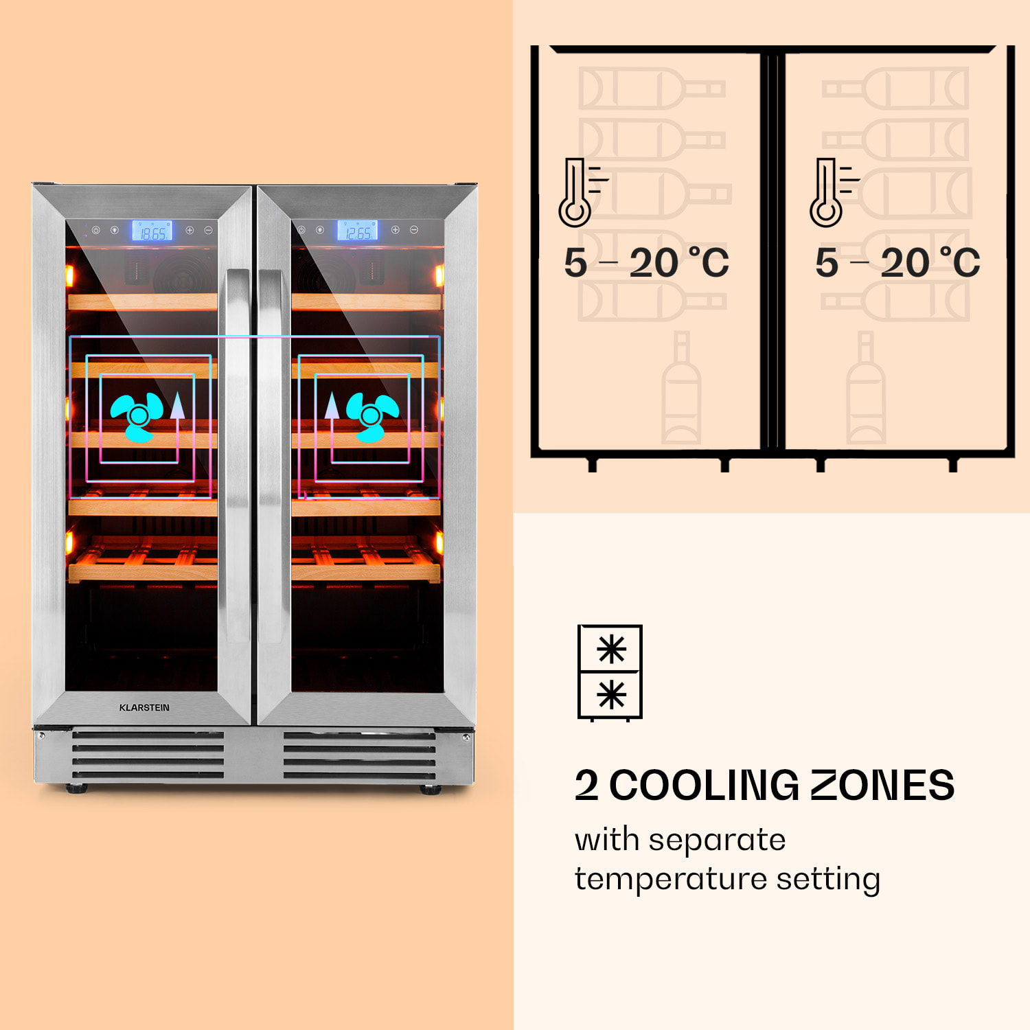 Klarstein Vinovilla Duo 42, dvojzónová vinotéka, 126 l, 42 fliaš, 3 farebné LED osvetlenie, sklenené dvere