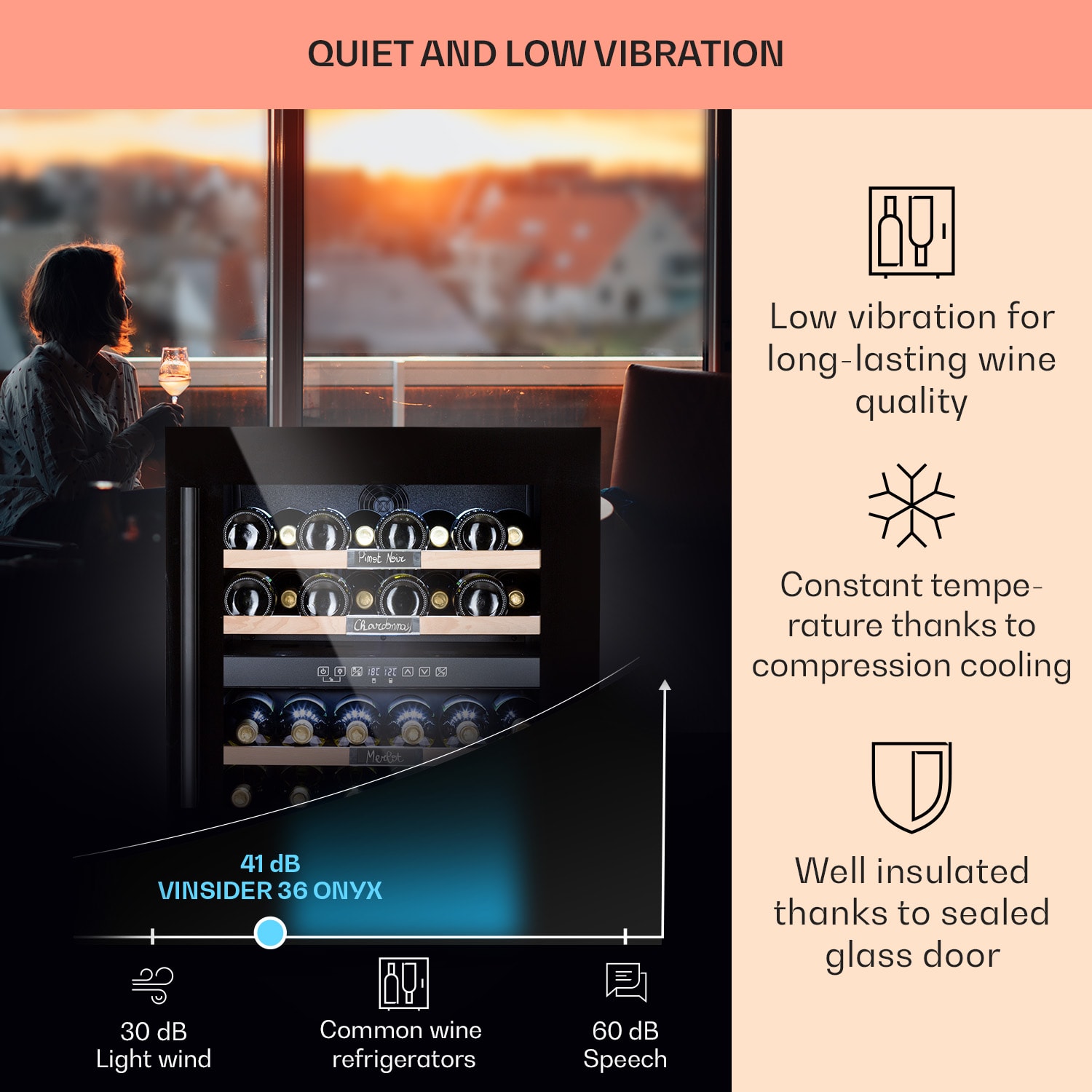 Vinotéka Vinsider 36 Onyx Edition od Klarstein: Optimálne uskladnenie vína vám zaručí ten najlepší pôžitok z pitia! Pomocou ušľachtilej 2-zónovej jednotky na reguláciu teploty vína môžete 36 fliaš toho najlepšieho vína priviesť na ideálnu, požadovanú teplotu na pitie, dlhodobo ich skladovať a prezentovať. Sklenené dvere s panoramatickým oknom a popísateľné policové zásuvky zabezpečujú dobrý prehľad, zatiaľ čo fľaše sú optimálne chránené pred vibráciami a dopadom svetla. Chlaďte červené a biele vína súčasne a skladujte ich optimálne: s luxusnou chladničkou na víno Vinsider 36 Onyx Edition od Klarstein, ktorá funguje aj ako vstavaná vinotéka.