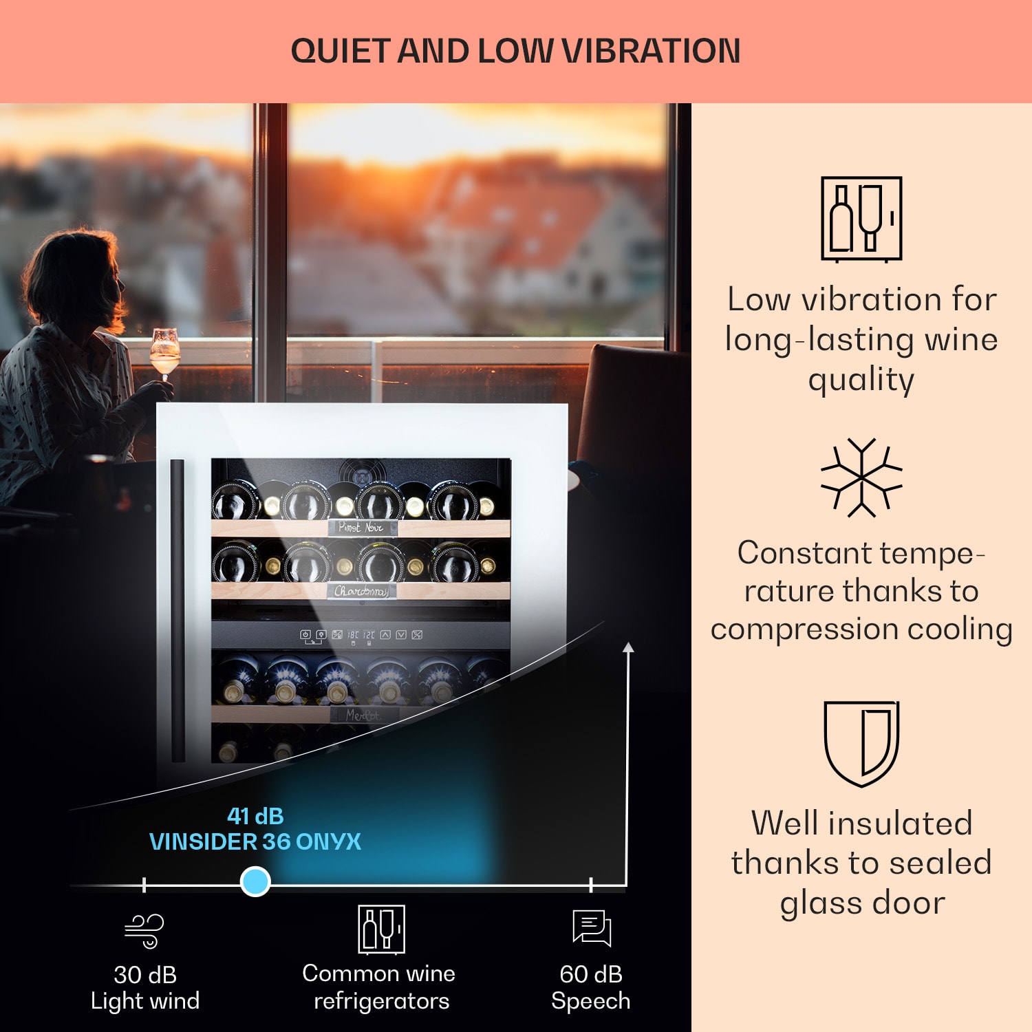 Vinotéka Vinsider 36 Quartz Edition od Klarstein: Optimálne uskladnenie vína vám zaručí ten najlepší pôžitok z pitia! Pomocou ušľachtilej 2-zónovej jednotky na reguláciu teploty vína môžete 36 fliaš toho najlepšieho vína priviesť na ideálnu teplotu požadovanú na pitie, dlhodobo ich skladovať i prezentovať. Sklenené dvere s panoramatickým oknom a popisovateľné policové zásuvky zabezpečujú dobrý prehľad, zatiaľ čo fľaše sú optimálne chránené pred vibráciami a dopadom svetla. Chlaďte červené i biele vína súčasne a optimálne ich skladujte: s luxusnou chladničkou na víno Vinsider 36 Quartz Edition od Klarstein, ktorá funguje aj ako vstavaná vinotéka.