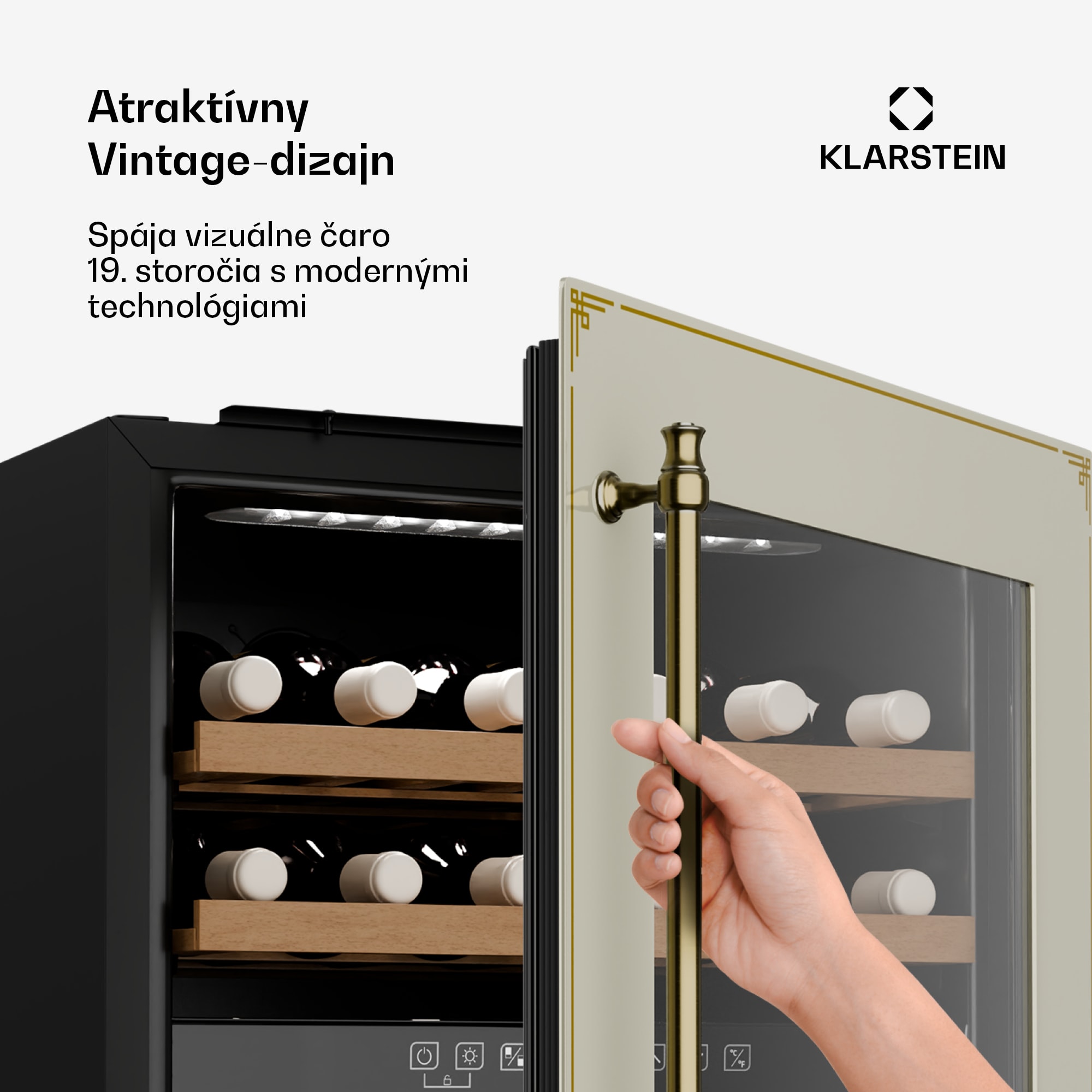 Vinotéka Klarstein Vinsider Victoria 36 kombinuje vintage dizajn s optimálnou funkčnosťou na dokonalé uskladnenie a prezentáciu vašich vín.S kapacitou až 36 fliaš ponúka chladnička na víno Klarstein Vinsider Victoria 36 dostatok priestoru pre vaše najcennejšie vína. Vysokokvalitné spracovanie s odnímateľnými drevenými policami v dvoch chladiacich zónach zaručuje nielen štýlovú prezentáciu, ale aj skladovanie bez vibrácií a s ochranou proti UV žiareniu, ktorá dlhodobo zachováva kvalitu vína. Intuitívne dotykové ovládanie umožňuje jednoduchú reguláciu teploty v rozsahu od 5 do 22 stupňov Celzia, takže vaše vína budú mať vždy ideálnu teplotu na pitie. Vďaka tichej prevádzke s hlučnosťou len 41 dB a elegantnému vnútornému LED osvetleniu chladnička na víno dokonale zapadne do každej kuchyne a vytvorí príjemnú atmosféru. Chladničku na víno je potrebné pravidelne čistiť a podľa potreby upravovať teplotu, aby sa zabezpečilo optimálne skladovanie vašich vín. Táto vstavaná vinotéka je ideálnym riešením pre každého milovníka vína.Vyskúšajte rozdiel a kúpte si chladničku na víno Klarstein Vinsider Victoria 36 pre dokonalé uskladnenie vína.