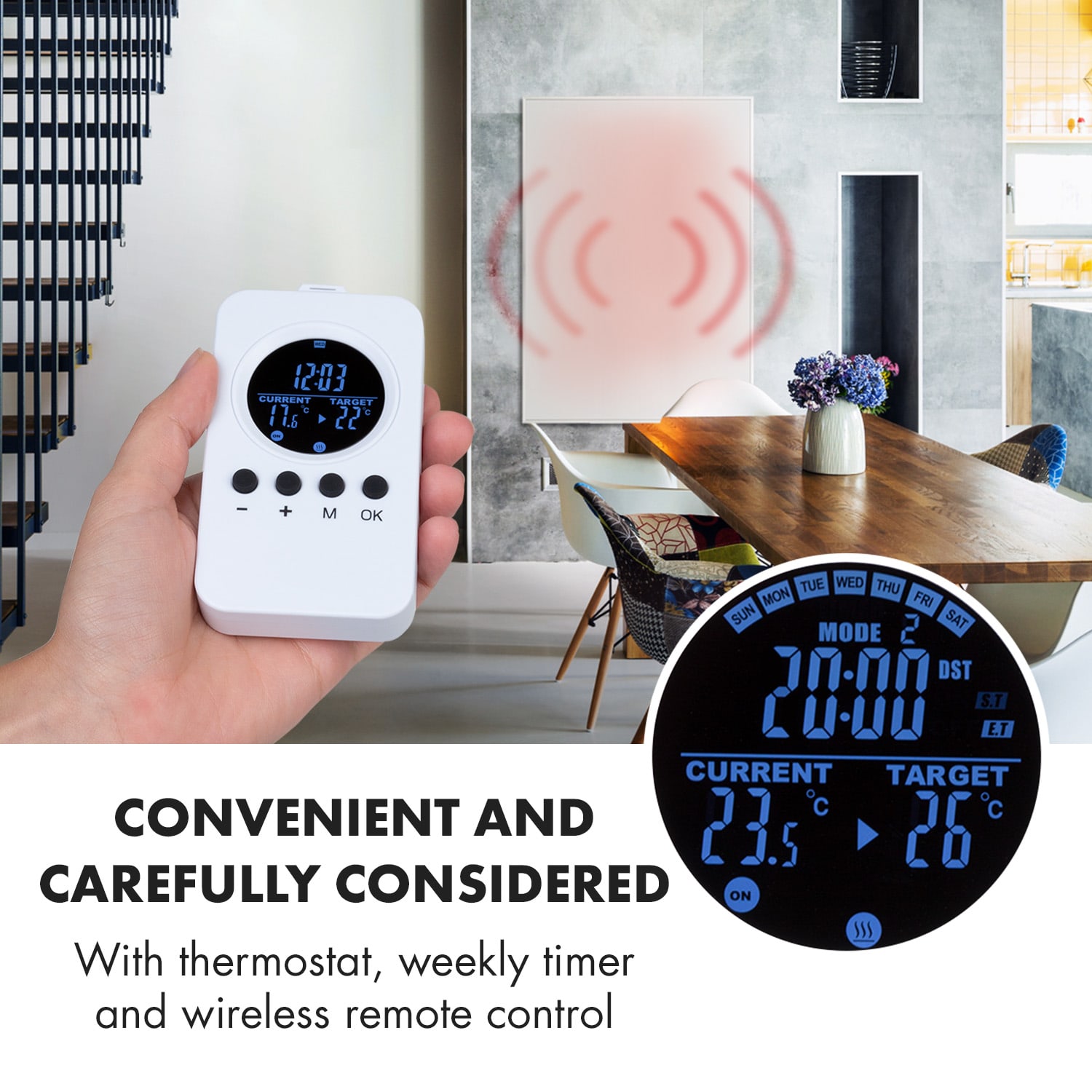S najnovšou technológiou pre príjemné teplo: infračervený ohrievač Klarstein Wonderwall Air 96 poskytuje príjemné teplo v každej miestnosti vysoko efektívnym a priestorovo úsporným spôsobom. Infračervený ohrievač Klarstein Wonderwall 96 predstavuje revolúciu vo vyhrievaní vďaka modernej technológii. Veľmi plochý vyhrievací panel, známy aj ako Infrapanel, možno zavesiť priamo na stenu, a preto poskytuje svoj vykurovací výkon mimoriadne úsporne. Vyžaruje infračervené teplo, ktoré je veľmi príjemné pre ľudskú pokožku, a vďaka inovatívnej technológii IR ComfortHeat vyžaruje teplo špeciálne pre ľudí v blízkosti, a nie do okolitého vzduchu. Vyhrievací panel je mimoriadne energeticky účinný: až 98 % energie sa premieňa na sálavé teplo. Vďaka termostatu a sofistikovaným funkciám, ako je funkcia automatického vypnutia a detekcia otvorených okien , spĺňa infračervený ohrievač aj tie najnáročnejšie požiadavky. Nastaviteľný týždenný časovač umožňuje naprogramovať doby vyhrievania pre každý deň v týždni. Bez ventilátora sa nevytvára prach, a preto je ohrievač ideálnou voľbou pre alergikov, pracuje ticho a je veľmi vhodný najmä do kúpeľne. Budúcnosť vykurovacej techniky: Nenápadný infračervený ohrievač Klarstein Wonderwall Air 96.