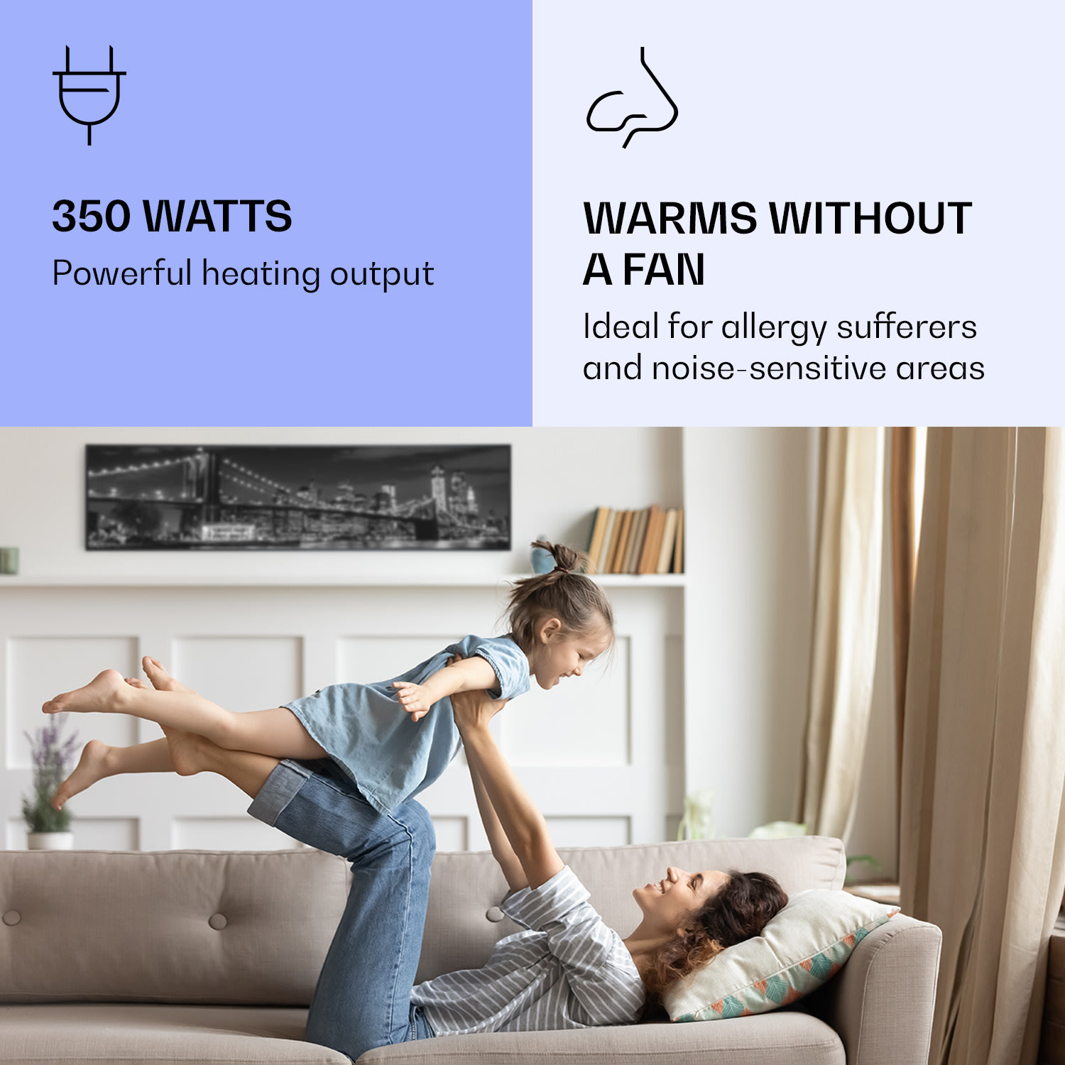 Infračervený ohrievačKlarstein Air Art Smart kombinuje vysoko efektívny vykurovací výkon s pôsobivým dizajnom a najnovšou technológiou. Prináša príjemné teplo a tiež nový lesk a farbu do každej miestnosti a pritom je energeticky veľmi efektívny a ekologický vďaka svojej infračervenej technológii. So svojím silným výkonom 350 W a vďaka technológii IR ComfortHeat šíri k ľudskej pokožke veľmi príjemné teplo, ktoré je vyžarované cielene na osoby v blízkosti ohrievača. Ovládaj veľmi jednoducho pomocou smartfónu, diaľkového ovládača alebo ovládacieho panela jeden ohrievač alebo viacero ohrievacích zariadení. Tento Infrapanel obraz sa dokonale hodí do každého interiéru. Vitaj v budúcnosti vykurovacej techniky: infračervený ohrievačKlarstein Air Art Smart.
