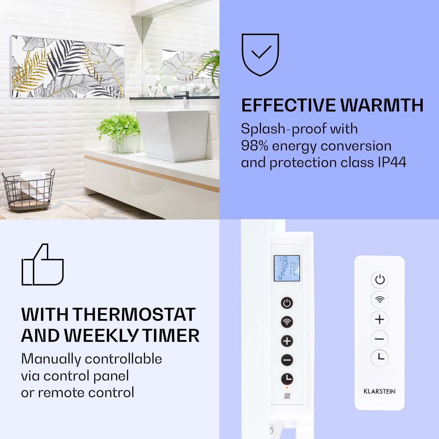 Infračervený ohrievačKlarstein Air Art Smart kombinuje vysoko efektívny vykurovací výkon s pôsobivým dizajnom a najnovšou technológiou. Prináša príjemné teplo a tiež nový lesk a farbu do každej miestnosti a pritom je energeticky veľmi efektívny a ekologický vďaka svojej infračervenej technológii. So svojím silným výkonom 700 W a vďaka technológii IR ComfortHeat šíri k ľudskej pokožke veľmi príjemné teplo, ktoré je vyžarované cielene na osoby v blízkosti ohrievača. Ovládaj veľmi jednoducho pomocou smartfónu, diaľkového ovládača alebo ovládacieho panela jeden ohrievač alebo viacero ohrievacích zariadení. Tento Infrapanel obraz sa dokonale hodí do každého interiéru. Vitaj v budúcnosti vykurovacej techniky: infračervený ohrievačKlarstein Air Art Smart.