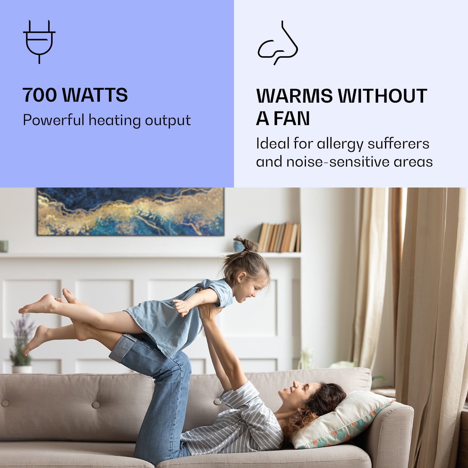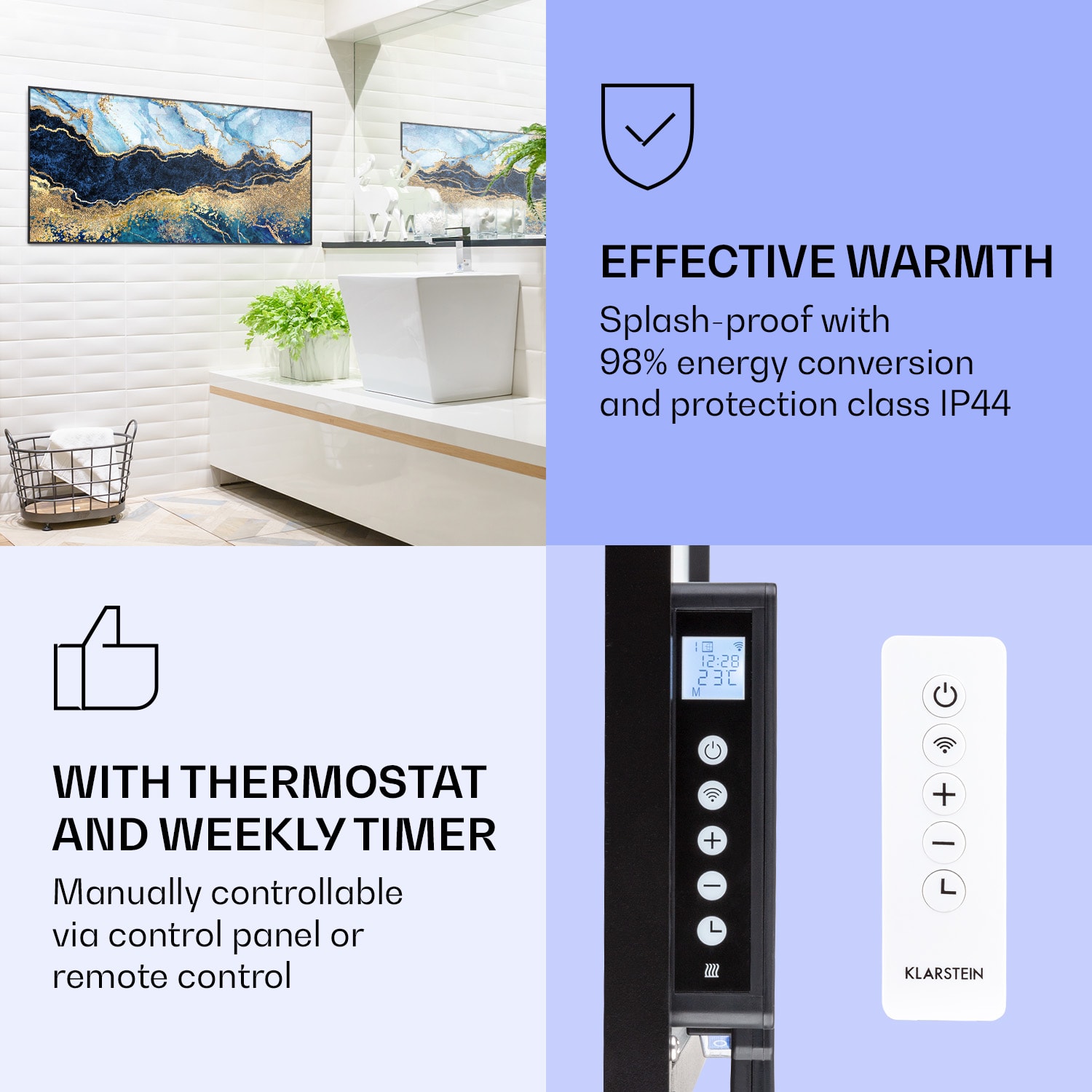 Infračervený ohrievačKlarstein Air Art Smart kombinuje vysoko efektívny vykurovací výkon s pôsobivým dizajnom a najnovšou technológiou. Prináša príjemné teplo a tiež nový lesk a farbu do každej miestnosti a pritom je energeticky veľmi efektívny a ekologický vďaka svojej infračervenej technológii. So svojím silným výkonom 700 W a vďaka technológii IR ComfortHeat šíri k ľudskej pokožke veľmi príjemné teplo, ktoré je vyžarované cielene na osoby v blízkosti ohrievača. Ovládaj veľmi jednoducho pomocou smartfónu, diaľkového ovládača alebo ovládacieho panela jeden ohrievač alebo viacero ohrievacích zariadení. Tento Infrapanel obraz sa dokonale hodí do každého interiéru. Vitaj v budúcnosti vykurovacej techniky: infračervený ohrievačKlarstein Air Art Smart.