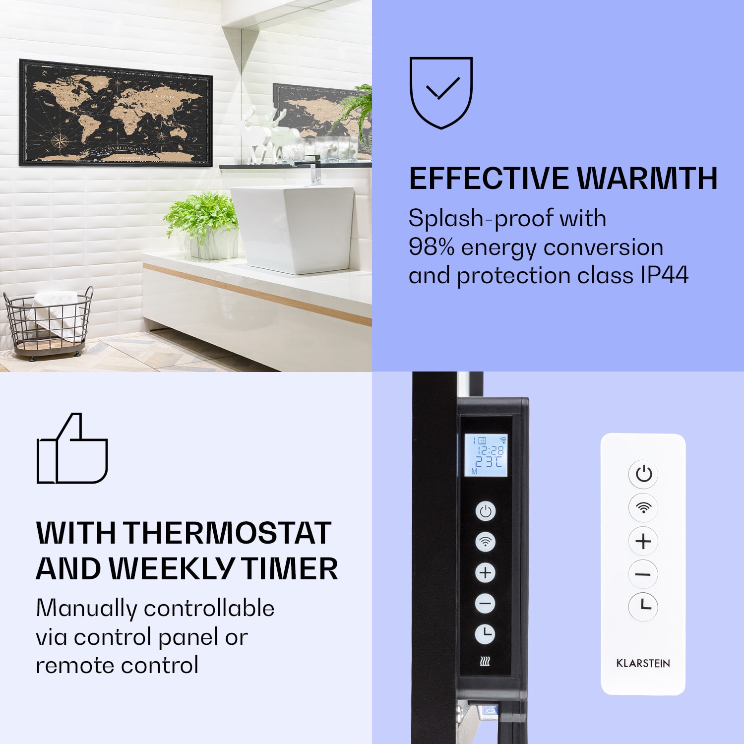 Infračervený ohrievačKlarstein Air Art Smart kombinuje vysoko efektívny vykurovací výkon s pôsobivým dizajnom a najnovšou technológiou. Prináša príjemné teplo a tiež nový lesk a farbu do každej miestnosti a pritom je energeticky veľmi efektívny a ekologický vďaka svojej infračervenej technológii. So svojím silným výkonom 700 W a vďaka technológii IR ComfortHeat šíri k ľudskej pokožke veľmi príjemné teplo, ktoré je vyžarované cielene na osoby v blízkosti ohrievača. Ovládaj veľmi jednoducho pomocou smartfónu, diaľkového ovládača alebo ovládacieho panela jeden ohrievač alebo viacero ohrievacích zariadení. Tento Infrapanel obraz sa stane štýlovým doplnkom každej miestnosti. Vitaj v budúcnosti vykurovacej techniky: infračervený ohrievačKlarstein Air Art Smart.