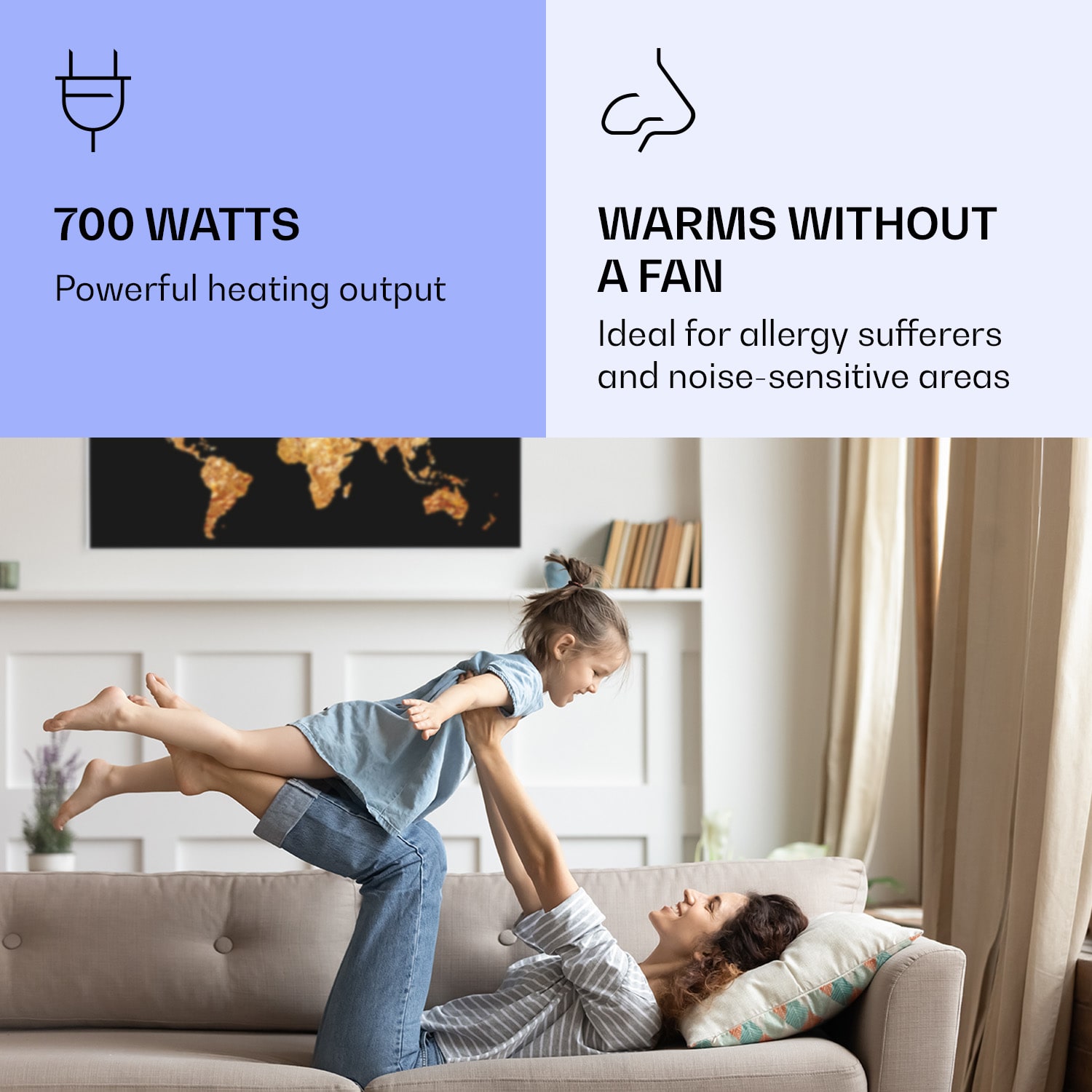 Infračervený ohrievačKlarstein Air Art Smart kombinuje vysoko efektívny vykurovací výkon s pôsobivým dizajnom a najnovšou technológiou. Prináša príjemné teplo a tiež nový lesk a farbu do každej miestnosti a pritom je energeticky veľmi efektívny a ekologický vďaka svojej infračervenej technológii. So svojím silným výkonom 700 W a vďaka technológii IR ComfortHeat šíri k ľudskej pokožke veľmi príjemné teplo, ktoré je vyžarované cielene na osoby v blízkosti ohrievača. Ovládaj veľmi jednoducho pomocou smartfónu, diaľkového ovládača alebo ovládacieho panela jeden ohrievač alebo viacero ohrievacích zariadení. Tento Infrapanel obraz sa dokonale hodí do každého interiéru. Vitaj v budúcnosti vykurovacej techniky: infračervený ohrievačKlarstein Air Art Smart.