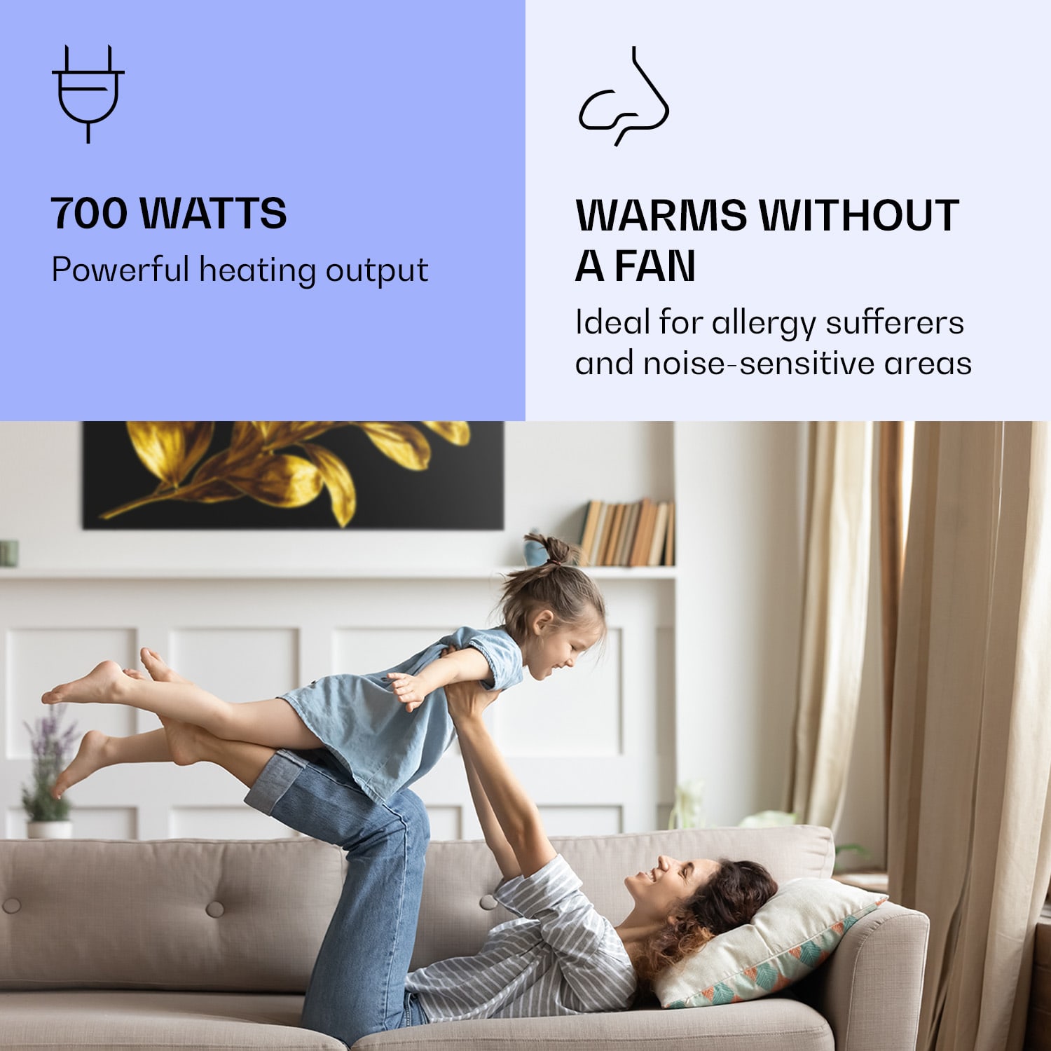 Infračervený ohrievačKlarstein Air Art Smart kombinuje vysoko efektívny vykurovací výkon s pôsobivým dizajnom a najnovšou technológiou. Prináša príjemné teplo a tiež nový lesk a farbu do každej miestnosti a pritom je energeticky veľmi efektívny a ekologický vďaka svojej infračervenej technológii. So svojím silným výkonom 700 W a vďaka technológii IR ComfortHeat šíri k ľudskej pokožke veľmi príjemné teplo, ktoré je vyžarované cielene na osoby v blízkosti ohrievača. Ovládaj veľmi jednoducho pomocou smartfónu, diaľkového ovládača alebo ovládacieho panela jeden ohrievač alebo viacero ohrievacích zariadení. Tento Infrapanel obraz sa dokonale hodí do každého interiéru. Vitaj v budúcnosti vykurovacej techniky: infračervený ohrievačKlarstein Air Art Smart.