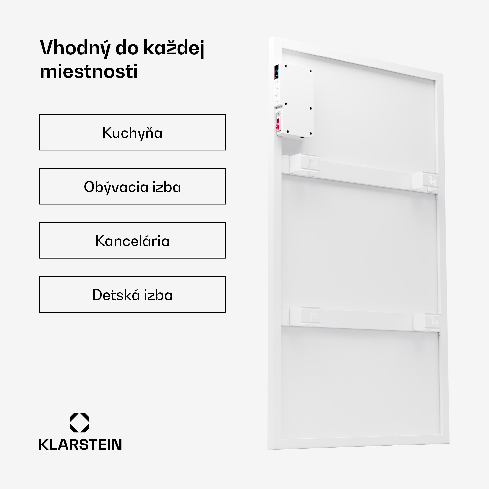 Najnovšia technológia pre príjemné teplo: Infračervený ohrievač Klarstein Wonderwall 480 prináša príjemné teplo do každej miestnosti vysoko efektívnym a priestorovo úsporným spôsobom.Infračervený ohrievač Wonderwall prináša revolúciu vo vykurovaní pomocou moderných technológií. Extrémne plochý, nenápadný vyhrievací panel je možné zavesiť priamo na stenu a svoju úlohu tak plní mimoriadne priestorovo úsporným spôsobom. Vďaka IR ComfortHeat využíva princíp solárneho tepla: namiesto pomalého ohrevu vzduchu vyžaruje príjemné infračervené tepelné lúče, ktoré priamo cielene ohrievajú ľudí a predmety v dosahu. Váš nový Infrapanel je mimoriadne energeticky účinný: celých 95 % spotrebovanej energie sa premení na tepelné lúče a nedochádza k rozvíreniu prachu ani hluku. Vďaka robustnému hliníkovému telu s triedou ochrany IP24 môže Wonderwall Air Smart ľahko zabezpečiť príjemné teplo aj v kúpeľni.Teraz ešte inteligentnejšie: Nové infražiariče Klarstein Wonderwall Air Smart 480 je možné pripojiť k lokálnej WiFi sieti a následne ich nielen ovládať odkiaľkoľvek cez Klarstein App Experience, ale sú aj plne kompatibilné s Alexa.