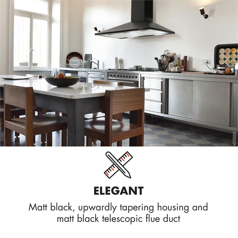Najlepší vzduch v kuchyni: Digestor Klarstein Zugspitze 90 dodá kuchyniam luxusnú a modernú črtu a spoľahlivo odstráni paru a výpary počas varenia. Digestor Klarstein Zugspitze 90 sa s výkonom motora 65 W v odsávacej prevádzke postará o vzduch bez výparov v stredne veľkých až veľkých kuchyniach. Tri výkonnostné stupne s maximálnym prietokom vzduchu až do 330 m³/h sa ciele zameriavajú na oblasť varnej dosky. Tri úrovne vetrania aj osvetlenie sú ľahko ovládateľné pomocou piatich tlačidiel prostredníctvom prednej ovládacej časti zariadenia. Zapínateľné svetlo s dvomi silnými 2,5 W LED svetlami efektívne osvetlí varnú plochu. Nástenný Digestor Klarstein Zugspitze 90 presvedčí nielen výkonnostnými údajmi, ale aj svojím luxusným výzorom: Takto sa v kuchyni stane špeciálnou ozdobou vďaka svojmu do hora sa zužujúcemu tvaru v matnej čiernej farbe. Dvojdielne obloženie komína z rovnakej matnej čiernej lakovanej ušľachtilej ocele dopĺňa kryt a schováva odsávaciu hadicu. Digestor možno prestavať pomocou filtra s aktívnym uhlím (produkt 10027451) na recirkulačnú prevádzku.