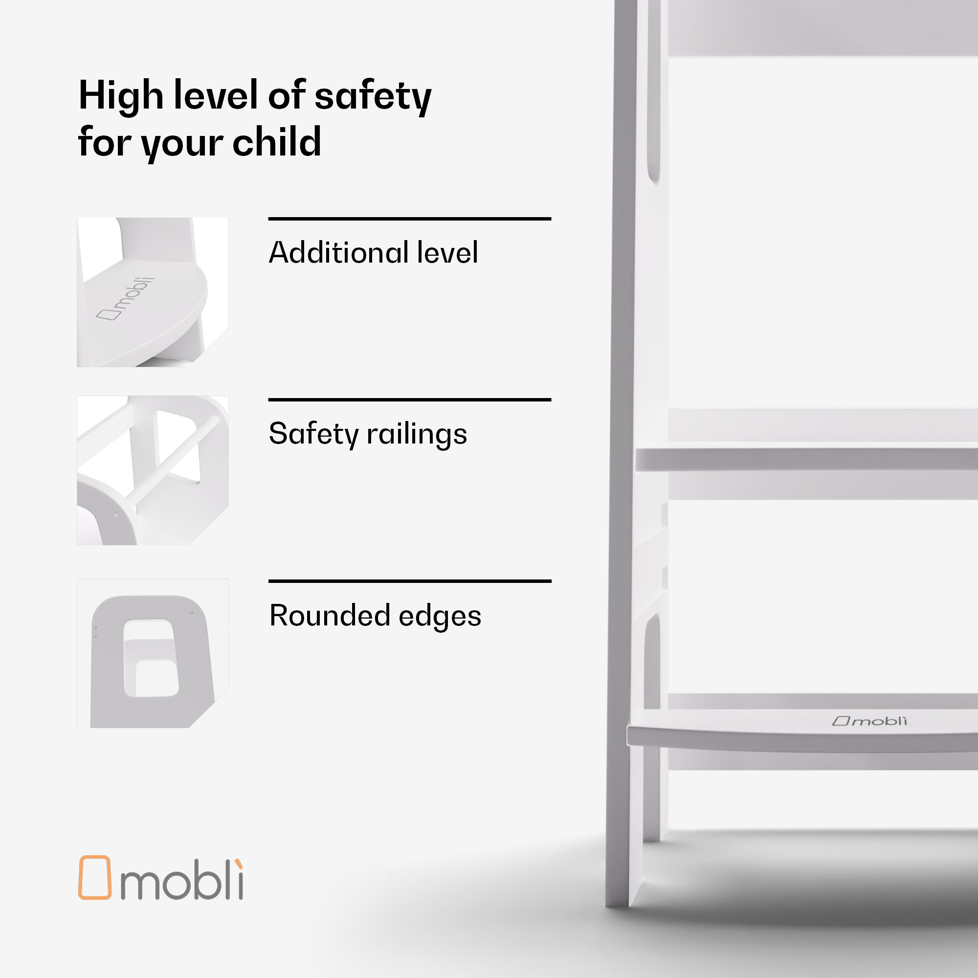 Vysoko a presne uprostred. Učebné veže mobli Ully umožňujú vášmu dieťaťu od 12. mesiaca nielen byť v prítomnosti, ale aj aktívne sa zapájať do mnohých aktivít pre dospelých, napríklad v kuchyni pri varení alebo v kúpeľni pri umývaní zubov. To podnecuje deti k samostatnému učeniu v duchu Montessori pedagogiky.Lezecká pomôcka mobli Ully je navrhnutá ako schodiskový rebrík a pomáha vášmu dieťaťu dostať sa do bezpečnej, vyvýšenej polohy. To umožní deťom dosiahnuť na pracovné dosky, dosky stolov alebo umývadlo v kúpeľni bez pomoci a povzbudí ich k samostatnosti. Držadlá a zábradlia zaisťujú bezpečnosť a stabilitu. Učebné veže sú vyrobené výhradne z extrémne stabilných MDF dosiek. Rohy a hrany sú úhľadne zaoblené. Základňu je možné nastaviť do troch výškových úrovní – 28, 34 a 40 cm – vďaka čomu môže lezecká veža rásť spolu s vaším dieťaťom.