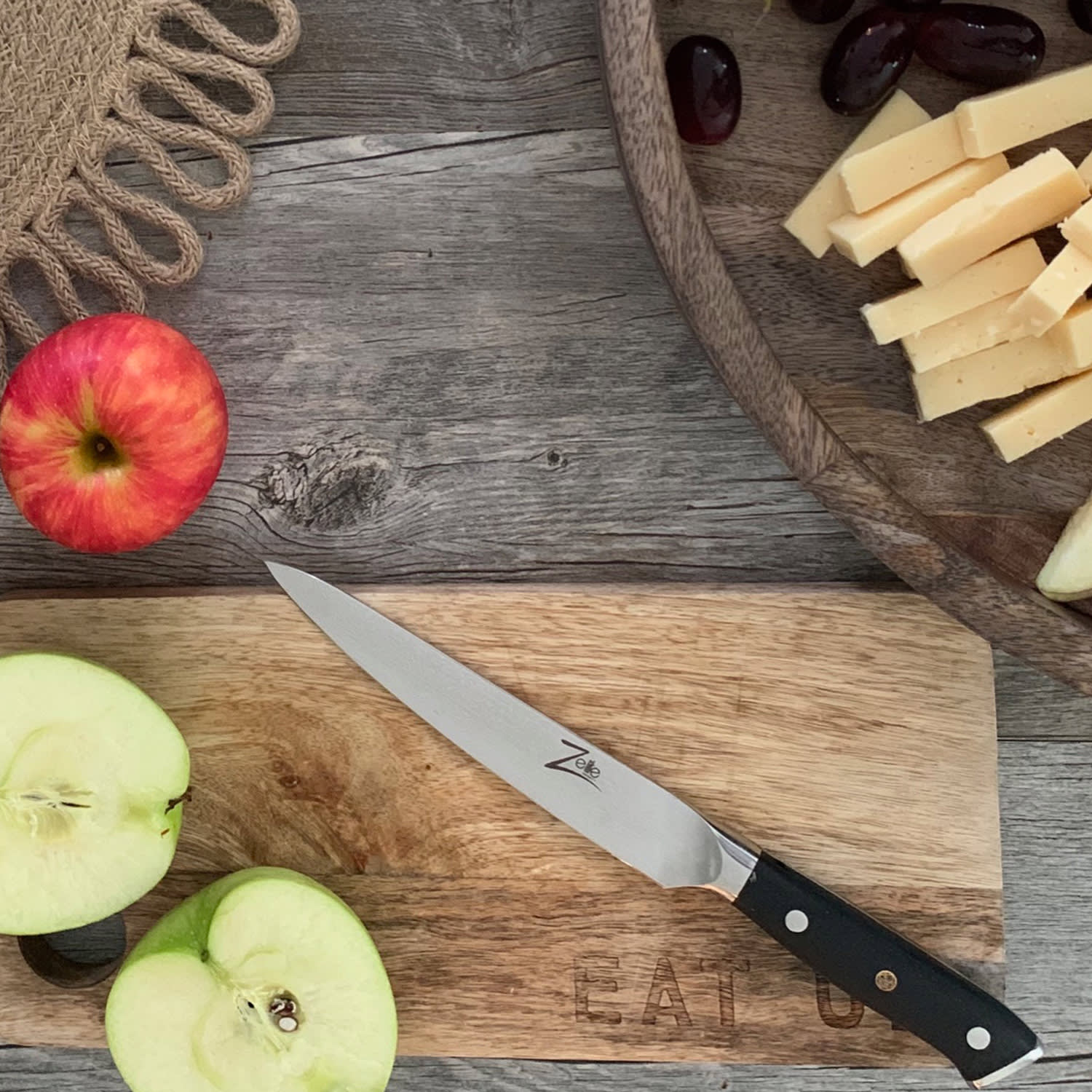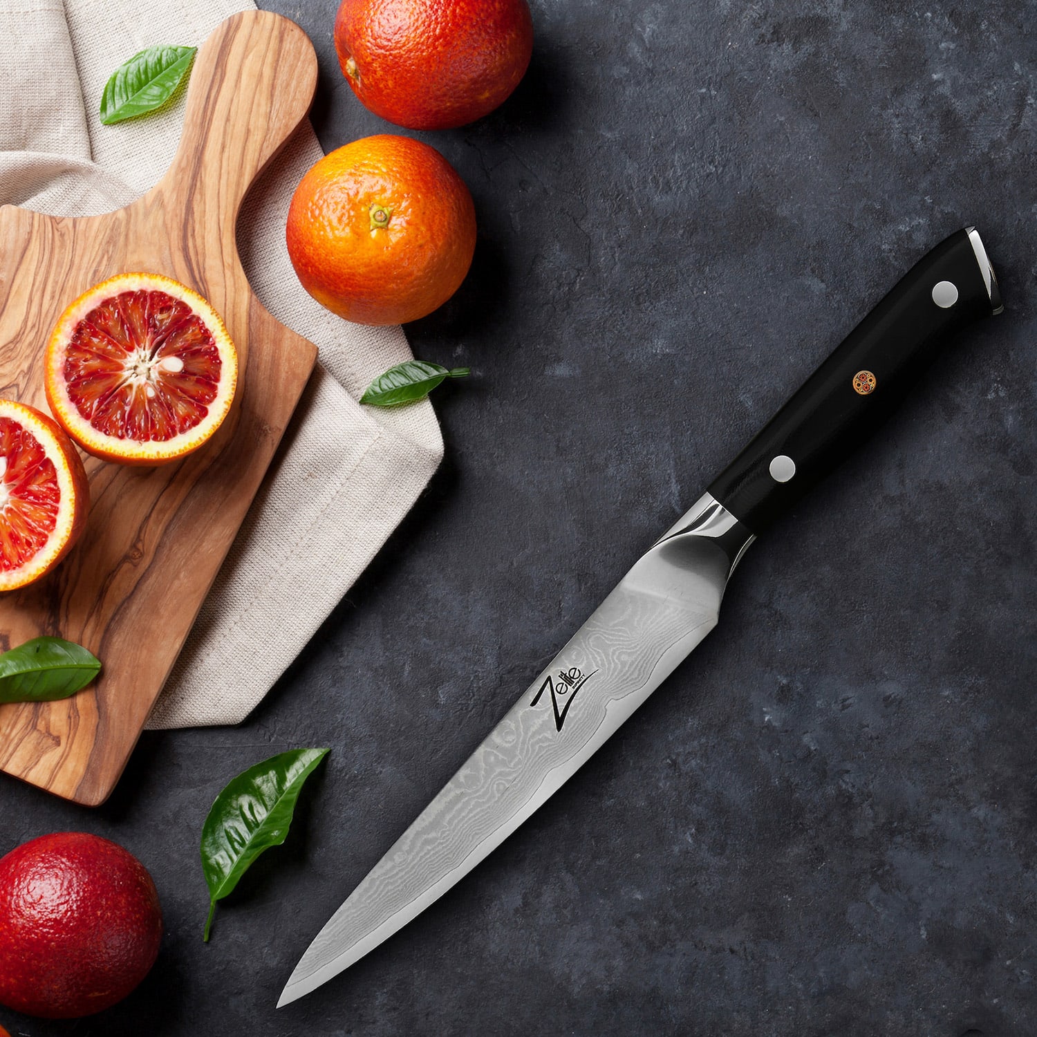 Exkluzívne a precízne nože podľa japonského vzoru: ručne brúsená séria nožov Zelite Infinity by Klarstein Alpha-Royal Japanese spĺňa vysoké nároky každého kuchárskeho umenia. Menistú čepeľ tvorí celkovo 67 vrstiev veľmi kvalitnej japonskej damaškovej ocele. Vďaka svojmu perfektne vyváženému a ergonomickému tvaru a hladkej rukoväti zo skleného vlákna G10 s tromi nitmi sedí tento elegantný kuchynský nástroj dokonale v ruke. Spája sa tu ostrosť, odolnosť, hmotnosť, ovládanie a manipulácia s výnimočným dizajnom, ktoré sú zdokonalené 3 umeleckými kovovými mozaikovými nitmi v rukoväti.Vždy pripravený: praktický univerzálny nôž nesmie chýbať v žiadnej v modernej kuchyni. 6″ univerzálny nôž je vyberaným všeobecným pomocníkom série Zelite Infinity by Klarstein Alpha-Royal Japanese. Kde je jeden nôž príliš veľký na čistenie zeleniny, ďalší zasa príliš malý na rozkrájanie ovocia alebo mäsa – tam nájde svoje využitie univerzálny nôž. Vďaka vynikajúcej odolnosti ostria zanecháva mimoriadne jemný rez, pričom sa na neho vďaka povrchovej úprave čepele nič neprilepí. Všestranne použiteľný kvalitný nôž je dobrý na krájanie manga alebo grapefruitu, na rezanie cukety, krájanie mäsa na kocky alebo na šúpanie zemiakov.