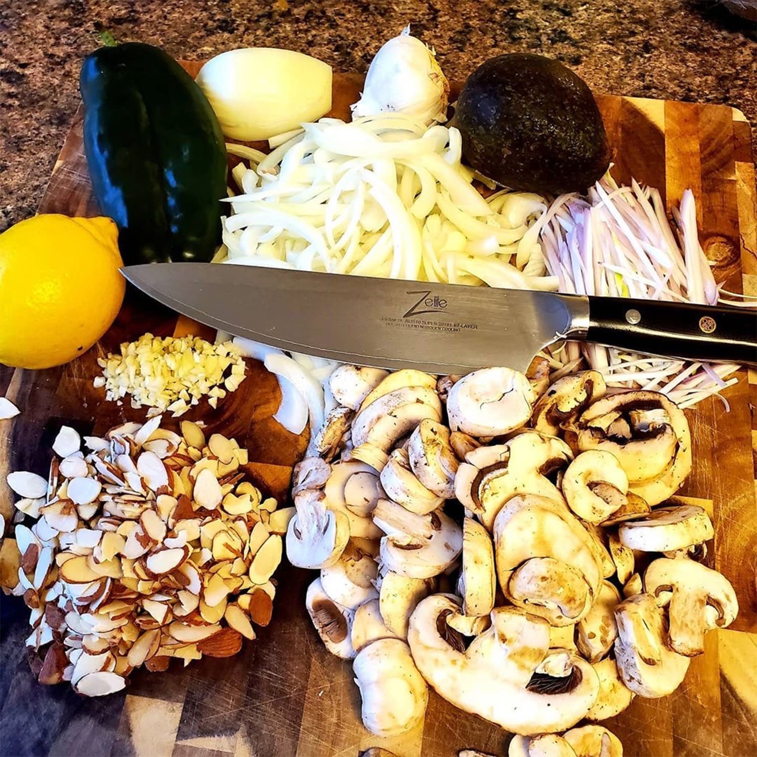 Exkluzívne a precízne nože podľa japonského vzoru: ručne brúsená séria nožov Zelite Infinity by Klarstein Alpha-Royal Japanese spĺňa vysoké nároky každého kuchárskeho umenia. Menistú čepeľ tvorí celkovo 67 vrstiev veľmi kvalitnej japonskej damaškovej ocele. Vďaka svojmu perfektne vyváženému a ergonomickému tvaru a hladkej rukoväti zo skleného vlákna G10 s tromi nitmi sedí tento elegantný kuchynský nástroj dokonale v ruke. Spája sa tu ostrosť, odolnosť, hmotnosť, ovládanie a manipulácia s výnimočným dizajnom, ktoré sú zdokonalené 3 umeleckými kovovými mozaikovými nitmi v rukoväti.8″ nôž šéfkuchára je exkluzívny nástroj zo série Alpha-Royal Japanese od Zelite Infinity by Klarstein. Vďaka svojej všestrannosti je cenným všestranným pomocníkom pri každodennom kulinárskom umení. Jeho exkluzívne vlastnosti vyplývajú predovšetkým zo zaoblenej hrany čepele v kombinácii s hladkou, kónicky zúženou záštitou a mimoriadne ostrou špičkou. Vďaka tomu je umožnený obľúbený úchop noža špičkových kuchárov s rýchlymi, hojdavými pohybmi. Širokou čepeľou nakrájané suroviny rýchlo zdvihneš a vložíš do hrnca bez toho, aby sa na noži prilepili. Budeš s ním sekať, rezať alebo krájať ako šéfkuchár a tento kuchársky nôž už nedáš z ruky!